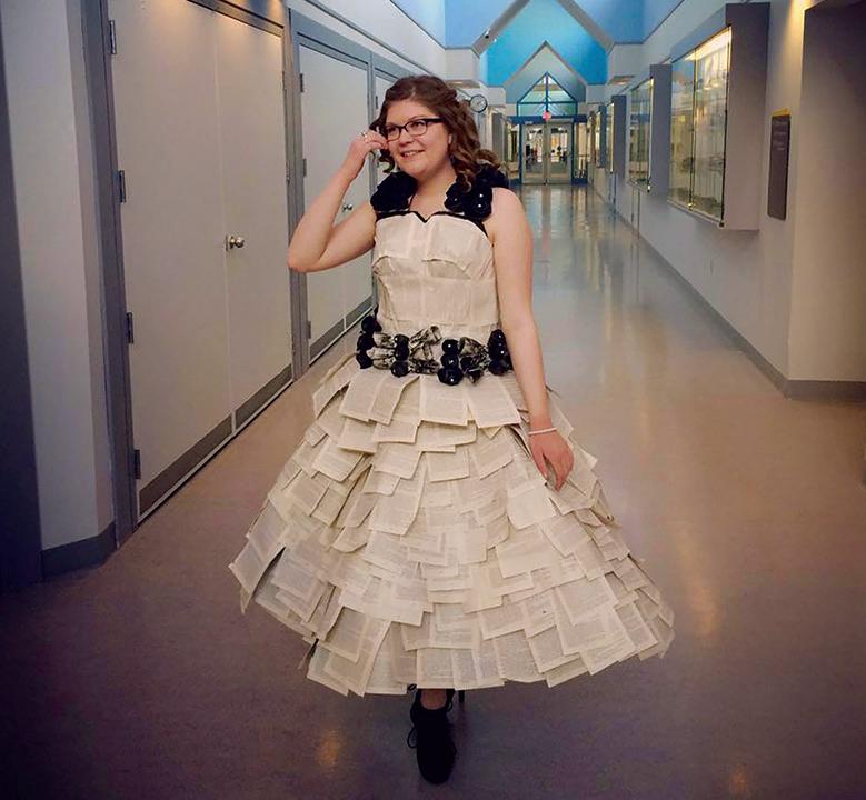 Anna Polsfut in 2015 modeling her dress constructed of book pages.