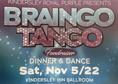 • Kindersley Royal Purple presents Braingo Tango Fundraiser Dinner & Dance at the Kindersley Inn Ballroom. Cocktails 5:30 PM; Dinner 6:00 PM, Silent Auction, Loonie Auction, Presentations. Dance at 9:00 PM. Tickets are $75. Available from Darlene 306-460-8947 or Dennis 306463-7283. Proceeds going to: Saskatchewan Brain Injury Association Food Bank & Women’s Shelter.