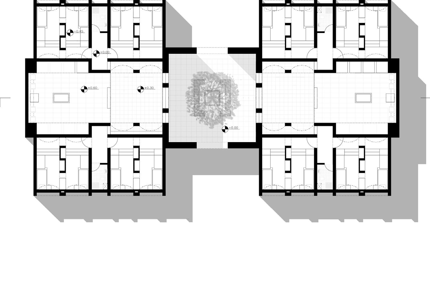 Built by the community, Kolda’s Secondary School is located 300m NW of the Casamance river, Ziguinchor, Senegal. The school consists of 3 main building modules revolving around a 15m Kapok tree. The horizental modules adopt a vaulted form cladded by metal sheet roof panels. The structure consists of rosewood beams and columns stabilised by clay walls. Within the structural grid, perforated laterite brick walls cools the passage of air before entering the spaces. 150 students are distributed into 6 classrooms. The classrooms are seperated from the central courtyard by a bamboo shaded loggia. As the student heads to class through the loggia, he notices that scenes on the either side of him are contrasting yet they’re still connected. Where the lack of vision and hearing creates a sense of mystery to the nature of the space behind these walls. Through the informal act of entrance to the project, the user feels that he enters a space of purpose, yet he is not disconnected from the outdoor environment.