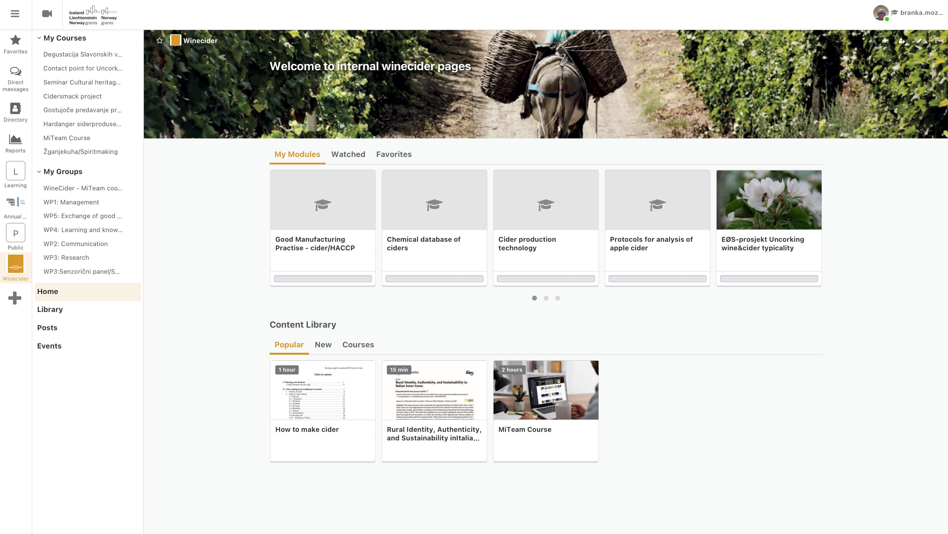 Figure 2: Internal winecider pages of the project ePlatform accesible upon registration and invitation to different virtual workspaces and groups designed upon project needs.