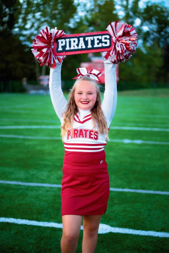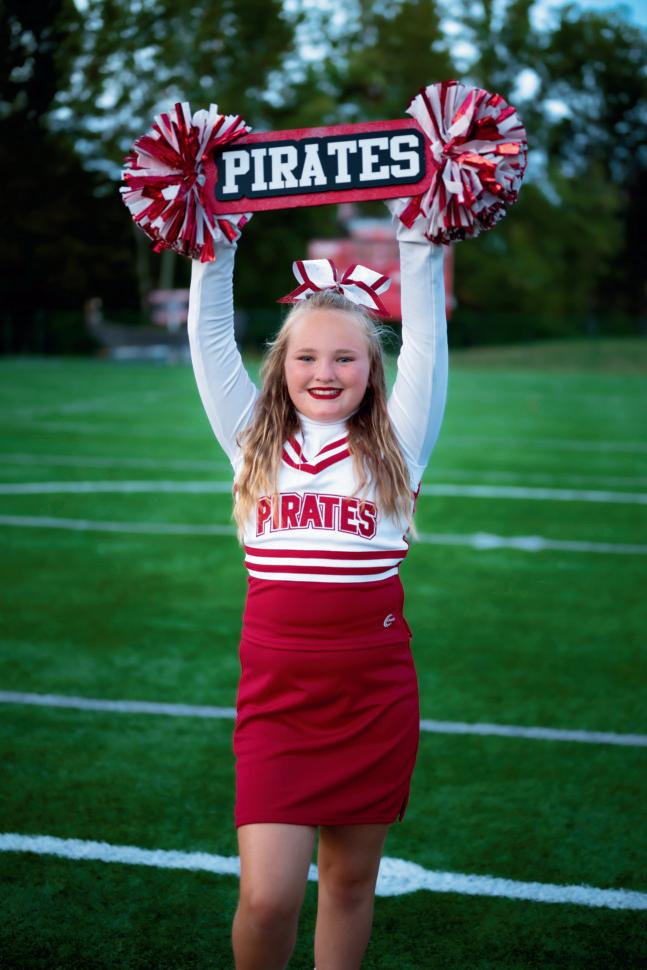 From Barboursville, West Virginia, Zoe Voelkel is a dedicated cheerleader whose energy and love for the sport shine through in everything she does. Now in her fourth year of cheer, Zoe began on the D Team and has steadily worked her way up, embracing every challenge along the journey. As a member of the Barboursville Pirates B Team Cheer, she enjoys staying active, being part of a team, and showing off her tumbling skills—often practicing handstands and cartwheels around the house.