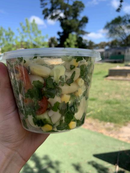 1. Meanwhile, thinly slice cucumber, grate carrot and chop spinach and cherry tomatoes. Mix together in a large bowl.