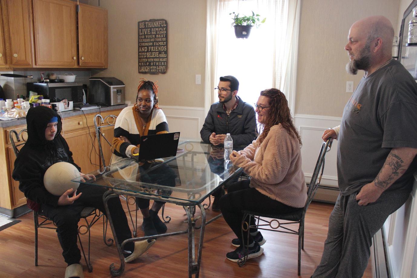 Jay (far left) and his parents discuss his progress at school with his family intervention specialist and supervisor.