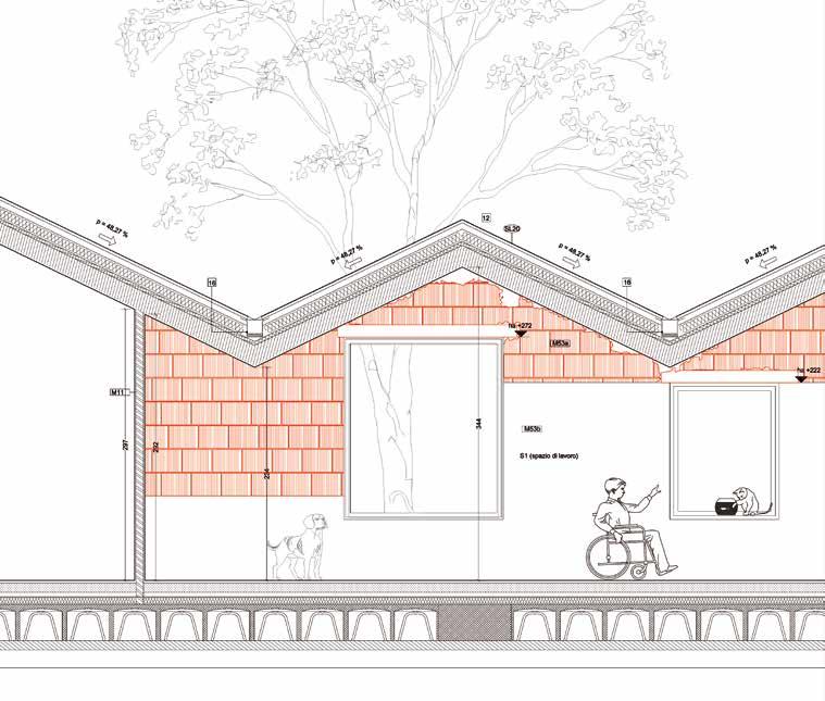 La volontà di creare un effetto di “movimento” e un gioco di irregolarità, dato dalla scomposizione in più elementi, si estende ad alcune superfici perimetrali, dove i mattoni faccia a vista del paramento murario esterno vengono fatti ruotare con diverse inclinazioni, creando una superficie irregolarmente corrugata. Questa innovativa modalità di apparecchiatura dei mattoni, oltre a creare un motivo decorativo originale rispetto alla tradizionale omogeneità delle superfici in mattoni faccia a vita, ha un preciso scopo funzionale: trasformare la muratura in una sorta di elemento schermante, capace di filtrare la radiazione solare e lasciar penetrare all’interno luce naturale e aria, favorendo il comfort degli spazi interni.