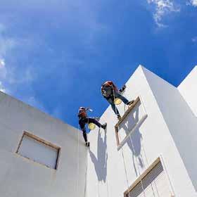 Pulizia grondaie in condominio. Sopra, edilzia in fune per il rifacimento di una facciata. A destra, ristrutturazione edificio industriale. Nella pagina a fianco, lavaggio professionale di vetri e finestre in un hotel