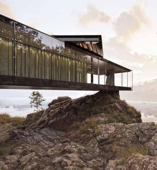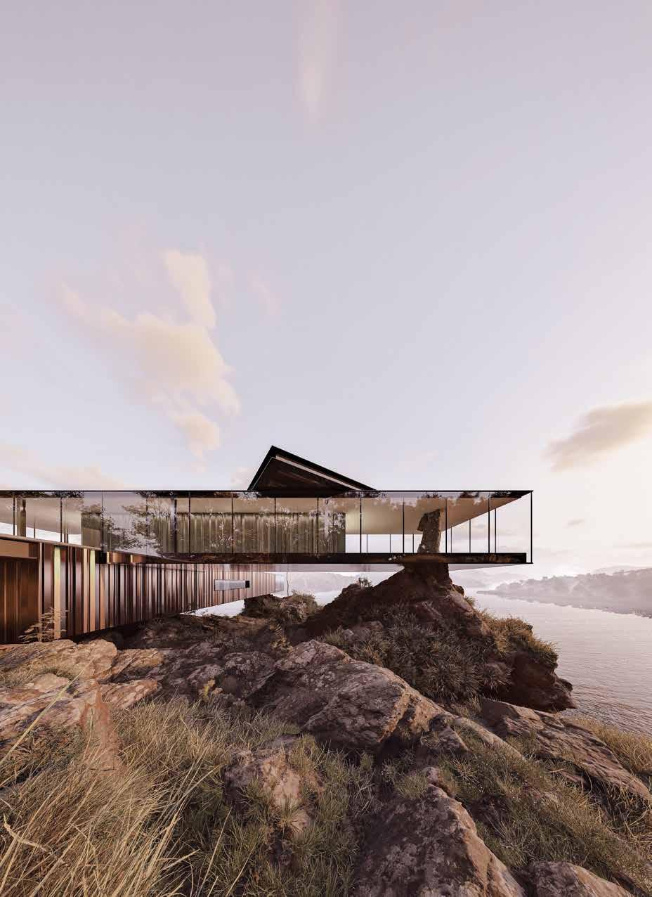 L’architettura proposta e rappresentativa per il lancio di questa sagoma è una gemma che si erge a picco su un abisso cobalto. Roots House, che enfatizza e racconta il design di Roots, rappresenta come l’inesorabile incedere del tempo possa plasmare la materia modificandola senza intaccarla: il materiale perfetto per questo racconto è il rame. Questo metallo viene presentato nella sua forma più pura per il rivestimento esterno: la finitura copper della sagoma frastagliata si fonde con lo spazio roccioso circostante. Il rame poi cambia
