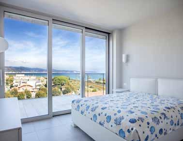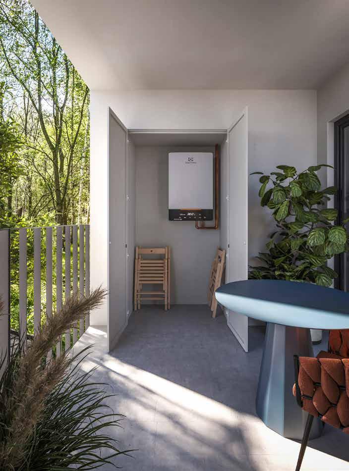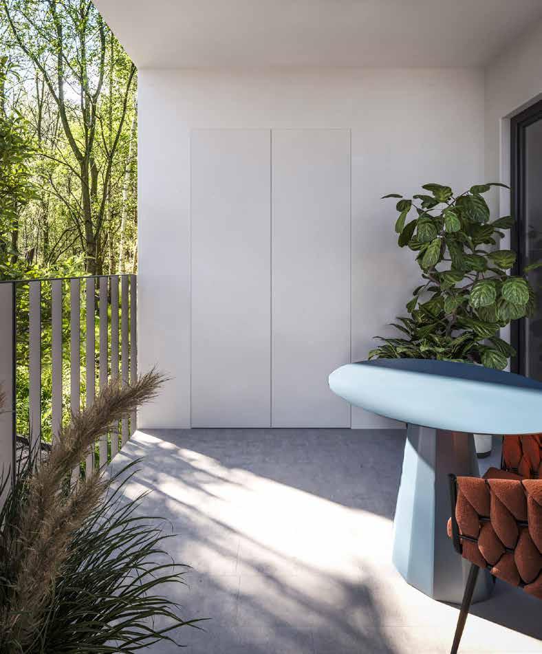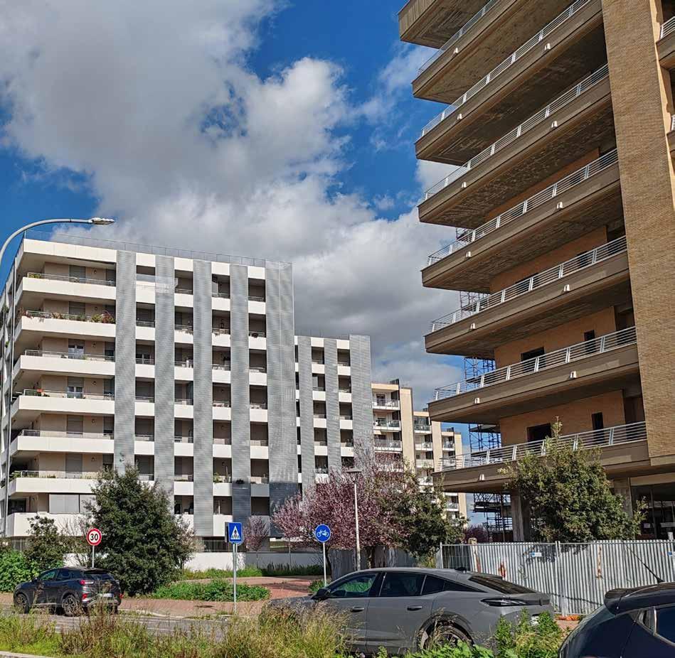 auditorium all’aperto. Le residenze sono progettate per offrire comfort e sostenibilità, con isolamento termoacustico avanzato e impianti ad alta efficienza energetica. La struttura è in calcestruzzo armato, la facciata esterna ventilata, realizzata con pannelli in fibrocemento per favorire l’integrazione con il contesto e migliorare il comfort climatico. Le aperture massimizzano la luce naturale, migliorano il comfort visivo e consentono una gradevole vista sul paesaggio. Infissi ad alte prestazioni con veneziane motorizzate integrate contribuiscono a creare ambienti silenziosi e termicamente equilibrati. Per l’efficienza energetica sono installati pannelli fotovoltaici in copertura, pompe di calore e sistemi domotici che permettono una gestione intelligente degli impianti. Il giardino pensile è anche una coibentazione naturale, capace di migliorare le prestazioni energetiche. I locali commerciali offrono layout facilmente personalizzabili e sono pensati per accogliere una varietà di attività compatibili con la vita di quartiere.