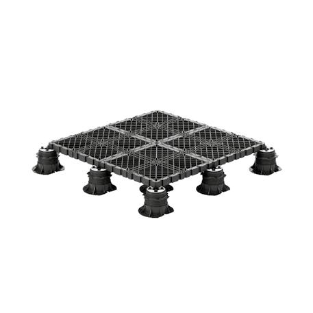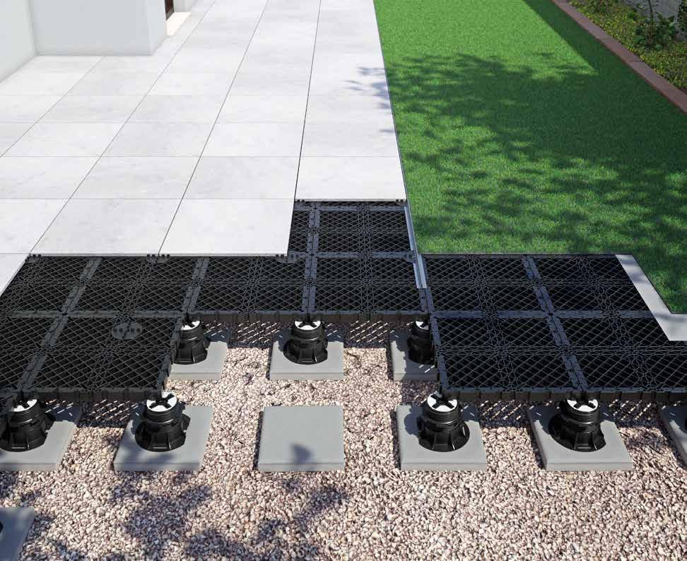 GRF System: a complete system for outdoor raised flooring that combines the stability of Pedestal supports with the flexibility and security of modular grids for laying slabs and other finishes.