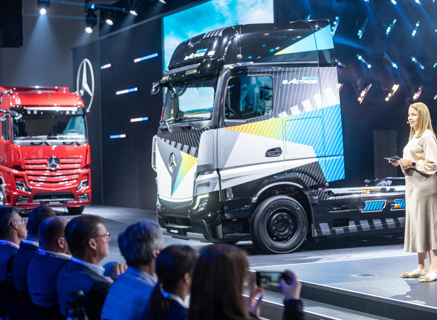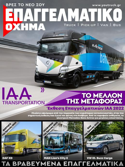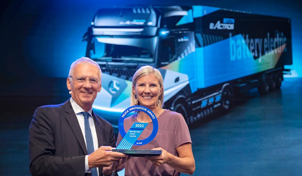 10 Έκθεση Επαγγελματικού Αυτοκινήτου Η IAA Transportation, εξέχουσα έκθεση επαγγελματικών οχημάτων, πραγματοποιήθηκε 20-25 Σεπτεμβρίου στο Ανόβερο, κι εκεί εκπροσωπήθηκε η βιομηχανία μεταφορών και logistics με περισσότερους από 1.400 εκθέτες από 42 χώρες. Στη νέα γενιά XD της DAF δόθηκε το περίφημο βραβείο «Διεθνές Φορτηγό της Χρονιάς 2023». Το ηλεκτρικό, αστικό λεωφορείο της MAN Truck & Bus στέφθηκε «Λεωφορείο της Χρονιάς 2023». Και το αμιγώς ηλεκτρικό Volkswagen ID Buzz κέρδισε τον τίτλο «International Van Of The Year 2023». Το Βραβείο Καινοτομίας 2023 πήγε στο eActros LongHaul της Mercedes-Benz. Το ηλεκτρικό φορτηγό έχει αυτονομία περίπου 500 χιλιομέτρων με μία μόνο φόρτιση μπαταρίας και είναι ικανό για φόρτιση υψηλών επιδόσεων. Η σειριακή πα ραγωγή έχει προγραμματιστεί για το 2024. Τα τελευταία χρόνια, το Mercedes-Benz eActros για μεταφορά διανομής βαρέως τύπου και το φορτηγό κυ ψελών καυσίμου με βάση το υδρογόνο Mercedes-Benz GenH2 Truck κέρδισαν επίσης το Βραβείο Καινοτομίας. Το Βραβείο Καινοτομίας 2023 στο eActros LongHaul της Mercedes-Benz ΕΙΔΗΣΕΙΣ / IAA Transportation 2022 To eActros LongHaul της Mercedes-Benz κέρδισε το Βραβείο Καινοτομίας 2023, ένα διάσημο βρα βείο που απονέμεται σε ιδιαίτερα καινοτόμα φορτη γά. Το βραβείο παρέλαβε η Karin Rådström, διευθύ νουσα σύμβουλος της Mercedes-Benz Trucks, από τον Gianenrico Griffini, πρόεδρο της κριτικής επιτροπής του IToY, (International Truck of the Year) σε εκδήλωση στο IAA Transportation 2022 στο Ανόβερο. Καθοριστική για την ψήφο ήταν η καινοτόμος τεχνολο γία μπαταριών φωσφορικού σιδήρου λιθίου (LFP), ο νέ ος ηλεκτρικός άξονας συνεχούς ισχύος 400 kW, καθώς και η ταχύτητα με την οποία το τμήμα Έρευνας και Εξέλι ξης της Mercedes-Benz Trucks δημιούργησε το όχημα. Το ηλεκτρικό eActros LongHaul για μεταφορές βαρέ ως τύπου μεγάλων αποστάσεων είναι το αποκορύφω μα της εμπορικής έκθεσης Mercedes-Benz Trucks και αποκαλύφθηκε ως πρωτότυπο σε συνέντευξη Τύπου ενόψει της IAA.