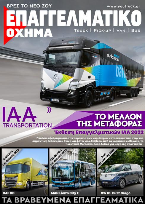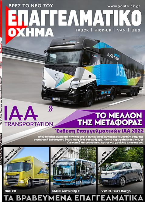 Η DAF Trucks προτείνει νέες λύσεις στις μεταφορές διανομής με το λανσάρισμα των DAF XD και XDC νέας γενιάς ενώ αποκαλύπτει μια εντελώς νέα σειρά πλήρως ηλεκτρικών συστημάτων κίνησης για τα φορτηγά DAF XD και XF νέας γενιάς. ΔΙΑΒΑΣΕ ΔΩΡΕΆΝ ΟΛΑ ΤΑ ΤΕΎΧΗ ΠΕΡΙΕΧΟΜΕΝΑ 52 IAA Transportation Ματιές στο MEΛΛΟΝ! Για έξι ημέρες, εμπορικοί επισκέπτες και λάτρεις μεταξύ 20 και 25 Σεπτεμβρίου για να θαυμάσουν σημαντικές τεχνικές καινοτομίες και ιδέες από 82 ΙΑΑ 2022 –Ford Pro Η Ford Pro παρουσίασε τις πιο πρόσφατες λύσεις της για τη μεγιστοποίηση του χρόνου λειτουργίας, της εξυπηρέτησης και της παραγωγικότητας. 90 ΙΑΑ 2022 –VW Επαγγελματικά Παράλληλα με το παγκοσμίως εξηλεκτρισμένο ID. Buzz και το εντελώς νέο pick-up Amarok, υπήρξαν ενδιαφέροντα ειδικά οχήματα από κατασκευαστές υπερκατασκευών με τα οποία παρουσιάστηκαν έξυπνες λύσεις σχεδόν σε όλες τις κατηγορίες. 86 ΙΑΑ 2022 –Renault Οι ηλεκτρικές εκδόσεις των ελαφρών επαγγελματικών της Renault, δεν ενέχουν κανένα συμβιβασμό σε σύγκριση με τις αντίστοιχες με θερμικούς κινητήρες, καθώς προσφέρουν το ίδιο επίπεδο εξοπλισμού, τα ίδια χαρακτηριστικά, την ίδια ευελιξία και τις ίδιες δυνατότητες εξατομίκευσης, ώστε να ικανοποιούν πλήρως τις ανάγκες των πελατών.