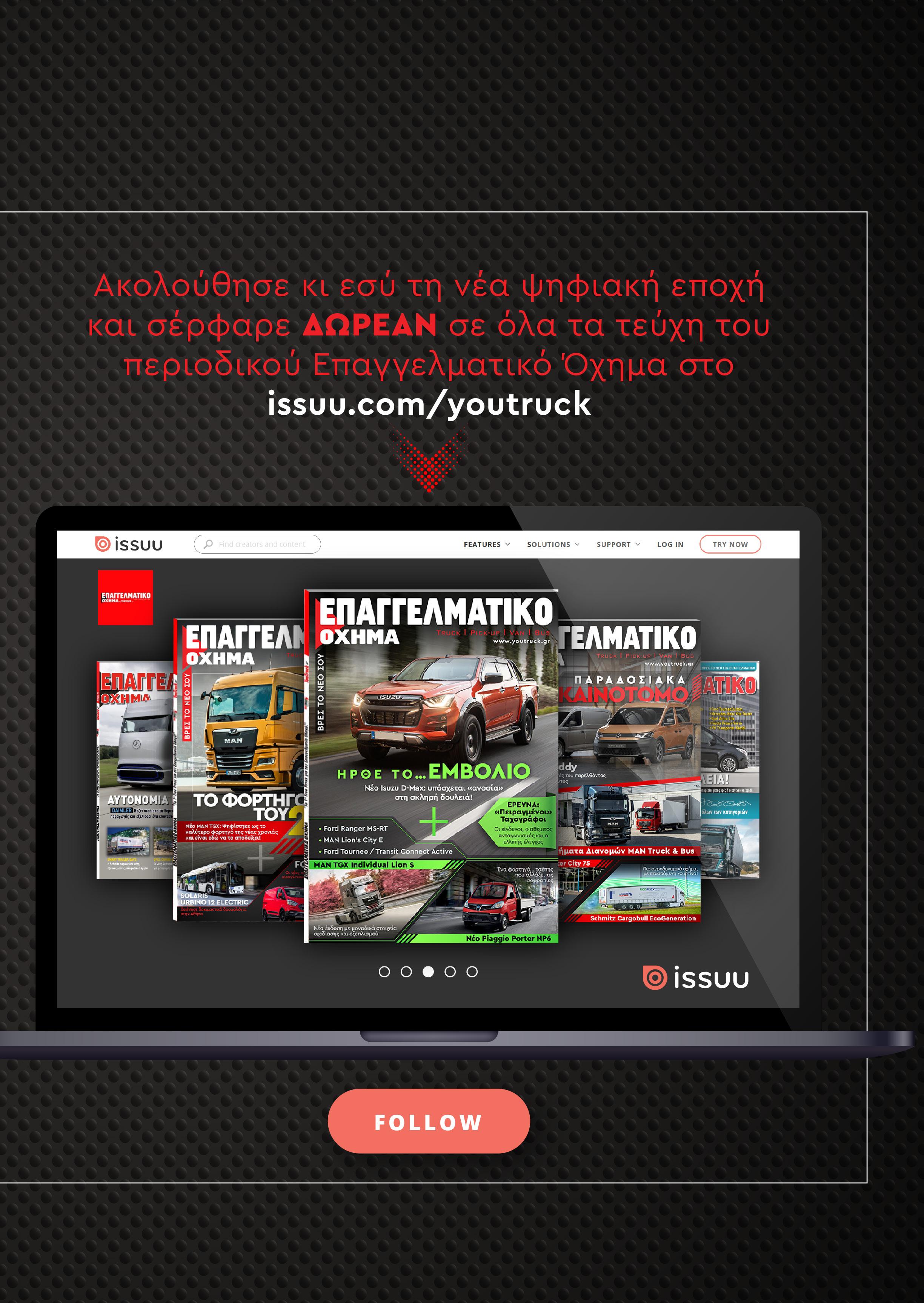 9 ΤΕΎΧΗ ΤΟΥ ΠΕΡΙΟΔΙΚΟΥ issuu.com/youtruck ΟΚΤΩΒΡΙΟΣ 2022 Βρες από τον κατάλογο μας επιλεγμένα συνεργεία από όλη την Ελλάδα Συνεργεία Μηχανουργεία Ταχογράφοι Ανταλλακτικά Αξεσουάρ SERVICE truck&bus by 106 | SERVICE TRUCK & BUS 10 Ειδήσεις Επιχειρείν και Μεταφορές Ελλάδα και Διεθνείς Όλα τα νέα που αφορούν την αγορά ελαφρών και βαρέων επαγγελματικών οχημάτων στην Ελλάδα και στον κόσμο. Διεθνείς εξελίξεις, ελληνική επικαιρότητα, ρεπορτάζ. Transportation 2022 MEΛΛΟΝ! λάτρεις της κινητικότητας από όλο τον κόσμο βρέθηκαν στο Ανόβερο θαυμάσουν και να δοκιμάσουν οι ίδιοι τις πιο συναρπαστικές και από τους τομείς των μεταφορών και της εφοδιαστικής αλυσίδας. εξατομίκευσης, 96 Στη Σεβίλλη με την Continental για τη νέα Generation 5 Για την παρουσίαση των νέων ελαστικών της Continental, Generation 5, ταξιδέψαμε στη μαγευτική Σεβίλλη, στην καρδιά της Ανδαλουσίας! 68 MAN