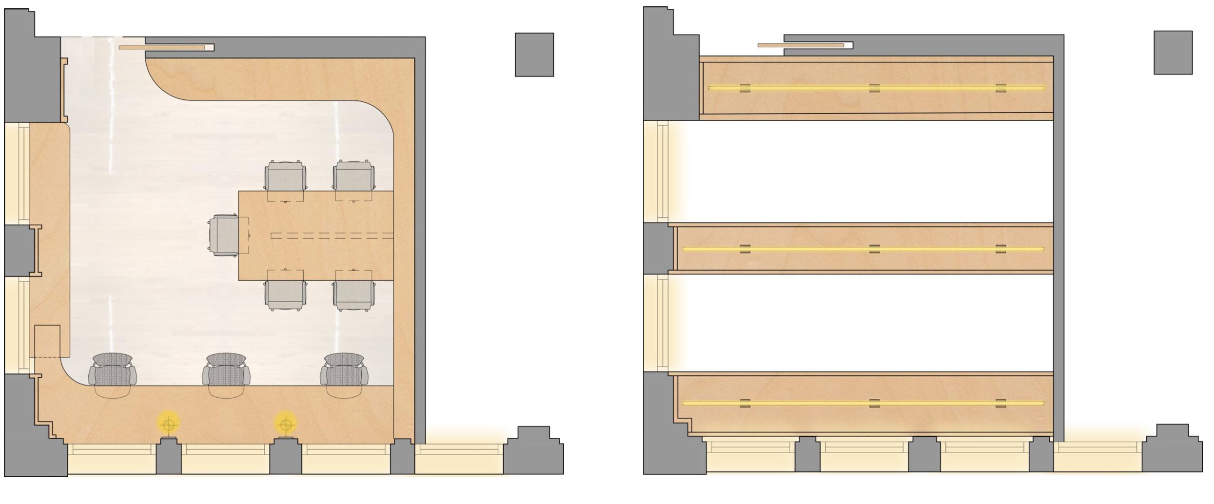The first floor of the archival space is sectioned off from the public and sits 15 feet above ground level. Accessible through the elevator lifts, located on the opposite ends of the archive, this private space feels dark and mysterious and full of curiousity. The archive is an intimate private well of knowledge. It will feature x-ray scans of famous designs and patterns throughout the years.