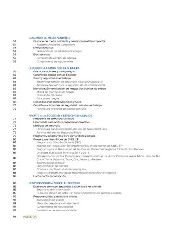 APORTE A LA SOCIEDAD Y DERECHOS HUMANOS Respeto a los derechos humanos Libertad de asociación y negociación colectiva Medidas de seguridad Principales responsabilidades del área de Seguridad Física Alcance del área de Seguridad Física Programas de desarrollo para comunidades locales Proyectos emblemáticos de CNEL EP Programa de Cocción Eficiente (PEC) Ahorros con la ejecución del programa PEC en los clientes de CNEL EP* Programa para la Renovación de Equipos de Consumo Energético Eficiente. Plan Renova Unidades Sustituidas en el año 2014 y 2015 Convenios con Juntas Parroquiales, Proyecto piloto en la Junta Parroquial Jesús María, Canuto, Río Chico, Tarifa, Sabanilla, Taura, Gral. Pedro J. Montero. Talleres de capacitación Regularización de clientes Charlas a clientes en distintas parroquias Programa FERUM (Fondo de electrificación rural urbano-marginal) Lucha contra la corrupción