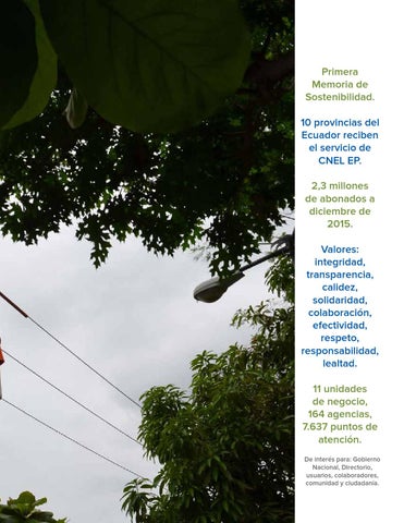 Primera Memoria de Sostenibilidad. 10 provincias del Ecuador reciben el servicio de CNEL EP. 2,3 millones de abonados a diciembre de 2015. Valores: integridad, transparencia, calidez, solidaridad, colaboraci贸n, efectividad, respeto, responsabilidad, lealtad. 11 unidades de negocio, 164 agencias, 7.637 puntos de atenci贸n. De inter茅s para: Gobierno Nacional, Directorio, usuarios, colaboradores, comunidad y ciudadan铆a.