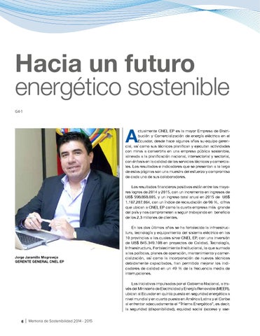 ctualmente CNEL EP es la mayor Empresa de Distribución y Comercialización de energía eléctrica en el Ecuador, desde hace algunos años su equipo gerencial, así como sus técnicos planifican y ejecutan actividades con miras a convertirla en una empresa pública sostenible, alineada a la planificación nacional, intersectorial y sectorial, con énfasis en la calidad de los servicios técnicos y comerciales. Los resultados e indicadores que se presentan a lo largo de estas páginas son una muestra del esfuerzo y compromiso de cada uno de sus colaboradores. Los resultados financieros positivos están entre los mayores logros de 2014 y 2015, con un incremento en ingresos de US$ 598.858.005, y un ingreso total anual en 2015 de US$ 1.167.207.064, con un índice de recaudación de 96 %, cifras que ubican a CNEL EP como la cuarta empresa más grande del país y nos comprometen a seguir trabajando en beneficio de los 2,3 millones de clientes.