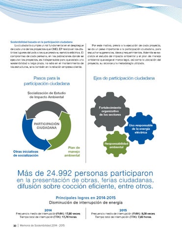 Sostenibilidad basada en la participación ciudadana La ciudadanía cumple un rol fundamental en el despliegue de cada uno de los proyectos que CNEL EP realiza en los distintos lugares del país a los que presta su servicio eléctrico. El compromiso de cada persona, en las poblaciones donde se ejecutan los proyectos, es indispensable para que exista una sostenibilidad a largo plazo, no sólo en el mantenimiento de las estructuras, sino también en la relación empresa-cliente.