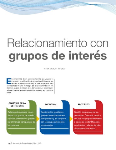 l compromiso de un servicio eficiente que vaya de la mano con la edificación de proyectos sólidos que beneficien a las comunidades y al país en general, está acompañado de una estrategia de relacionamiento con los distintos grupos de interés de la Corporación, a todos los niveles en los que se desenvuelve la empresa y sus colaboradores.