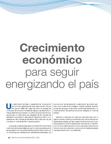 n crecimiento rentable y sostenible es fundamental para el buen desarrollo de toda organización. Es por ello que en CNEL EP, luego de iniciar el proceso de unificación de las once unidades de negocio, se desarrolló un trabajo dedicado para revertir una difícil situación económica, alcanzando un crecimiento de alrededor de 25 millones de dólares en facturación y recaudación efectiva en 2014, y alrededor de 165 millones de dólares en 2015. Hoy por hoy, se mantiene un nivel de 95.56 % de recaudación. ¿A qué se ha debido este logro financiero? Principalmente a los lineamientos estratégicos que han sido realizados por el equipo gerencial y los colaboradores, realizando en particular un ambicioso plan de Reducción de Pérdidas de Energía, así 44