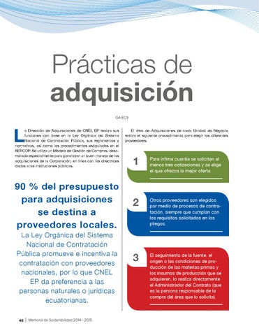 90 % del presupuesto para adquisiciones se destina a proveedores locales. La Ley Orgánica del Sistema Nacional de Contratación Pública promueve e incentiva la contratación con proveedores nacionales, por lo que CNEL EP da preferencia a las personas naturales o jurídicas ecuatorianas. 46