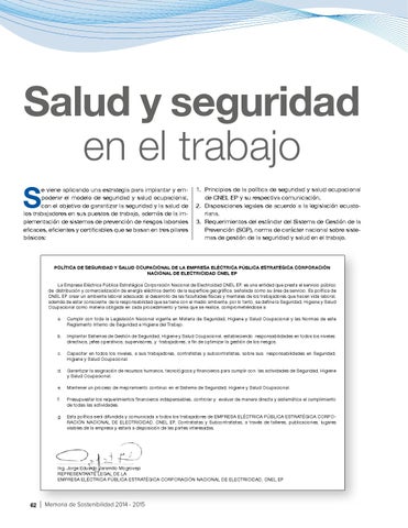 POLÍTICA DE SEGURIDAD Y SALUD OCUPACIONAL DE LA EMPRESA ELÉCTRICA PÚBLICA ESTRATÉGICA CORPORACIÓN NACIONAL DE ELECTRICIDAD CNEL EP La Empresa Eléctrica Pública Estratégica Corporación Nacional de Electricidad CNEL EP, es una entidad que presta el servicio público de distribución y comercialización de energía eléctrica dentro de la superficie geográfica, señalada como su área de servicio. Es política de CNEL EP crear un ambiente laboral adecuado al desarrollo de las facultades físicas y mentales de los trabajadores que hacen vida laboral, además de estar consciente de la responsabilidad que se tiene con el medio ambiente, por lo tanto, se define la Seguridad, Higiene y Salud Ocupacional como materia obligada en cada procedimiento y tarea que se realice, comprometiéndose a: a. Cumplir con toda la Legislación Nacional vigente en Materia de Seguridad, Higiene y Salud Ocupacional y las Normas de este Reglamento Interno de Seguridad e Higiene del Trabajo. b. Implantar Sistemas de Gestión de Seguridad, Higiene y Salud Ocupacional, estableciendo responsabilidades en todos los niveles: directivos, jefes operativos, supervisores, y trabajadores, a fin de optimizar la gestión de los riesgos. c. Capacitar en todos los niveles, a sus trabajadores, contratistas y subcontratistas, sobre sus responsabilidades en Seguridad, Higiene y Salud Ocupacional. d. Garantizar la asignación de recursos humanos, tecnológicos y financieros para cumplir con las actividades de Seguridad, Higiene y Salud Ocupacional. e. Mantener un proceso de mejoramiento continuo en el Sistema de Seguridad, Higiene y Salud Ocupacional. f.
