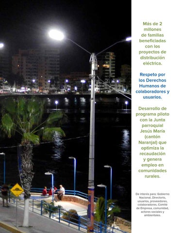 Más de 2 millones de familias beneficiadas con los proyectos de distribución eléctrica. Respeto por los Derechos Humanos de colaboradores y usuarios. Desarrollo de programa piloto con la Junta parroquial Jesús María (cantón Naranjal) que optimiza la recaudación y genera empleo en comunidades rurales.