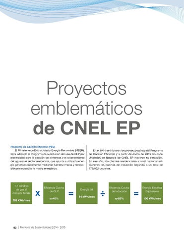 Proyectos emblemáticos de CNEL EP Programa de Cocción Eficiente (PEC) El Ministerio de Electricidad y Energía Renovable (MEER), lleva adelante el Programa de sustitución del uso de GLP por electricidad para la cocción de alimentos y el calentamiento del agua en el sector residencial, que apunta a utilizar la energía generada localmente mediante fuentes limpias y renovables para cambiar la matriz energética.