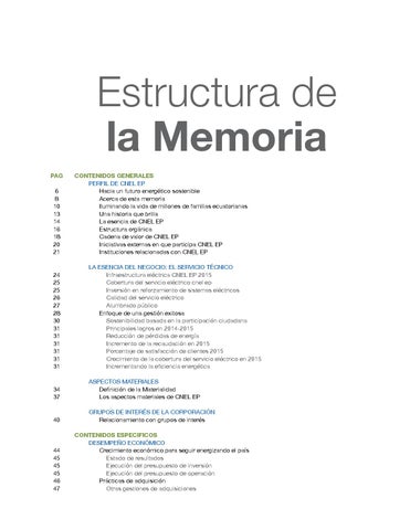 CONTENIDOS GENERALES PERFIL DE CNEL EP Hacia un futuro energético sostenible Acerca de esta memoria Iluminando la vida de millones de familias ecuatorianas Una historia que brilla La esencia de CNEL EP Estructura orgánica Cadena de valor de CNEL EP Iniciativas externas en que participa CNEL EP Instituciones relacionadas con CNEL EP