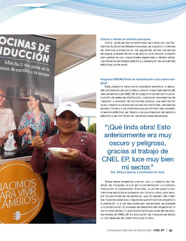 Programa FERUM (Fondo de electrificación rural urbano-marginal) Este programa tiene como propósito beneficiar a sectores ubicados en zonas rurales y urbano-marginales dentro del área de servicio de CNEL EP. El programa contempla la construcción de redes de distribución, instalación de sistemas de medición y provisión de alumbrado público, que permite sin duda, mejorar la calidad de vida de los habitantes, atendiendo de esta manera a las viviendas que por primera vez acceden al servicio eléctrico, se mejora a las que disponen del servicio eléctrico y se normalizan en aquellos casos requeridos.