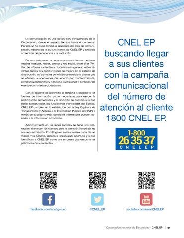 La comunicación es uno de los ejes transversales de la Corporación, desde el aspecto técnico hasta el comercial. Por ello se ha dado énfasis al desarrollo del área de Comunicación, mejorando la cultura interna de CNEL EP y creando un sentido de pertenencia a la institución. Por otro lado, externamente se procura informar mediante medios masivos, radios, prensa y red social, entre ellas Twitter. Se informa a clientes y ciudadanía en general, sobre diversos temas: las oportunidades de mejora en el sistema de distribución, así como los beneficios de servicio al cliente que se ofrecen, suspensiones del servicio por mantenimientos, campañas corporativas, noticias e invitaciones a participar de eventos como ferias ciudadanas. Con el objetivo de garantizar el derecho a acceder a las fuentes de información, como mecanismo para ejercer la participación democrática y la rendición de cuentas a la que están sujetos todos los funcionarios y entidades del Estado, CNEL EP cumple con lo establecido por la Ley Orgánica de Transparencia y Acceso a la Información Pública (LOTAIP) a través de su página web, donde los interesados pueden acceder a la información corporativa. Adicionalmente en las redes sociales se tiene una interacción diaria con los clientes, para la atención inmediata de sus requerimientos. El diálogo en estos canales cada día se vuelve más positivo, debido a la respuesta oportuna y a que identifican a CNEL EP como una empresa que escucha las peticiones de sus clientes.