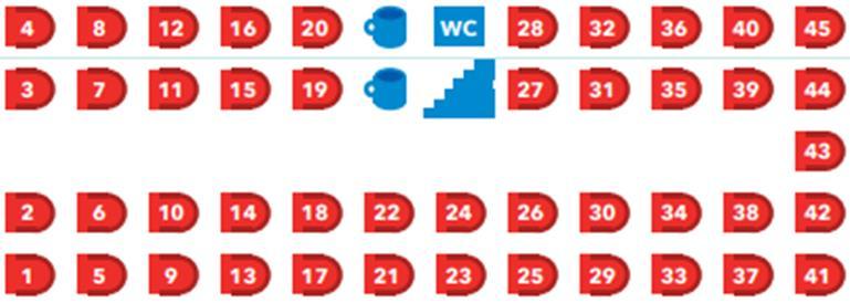 Please see below a copy of our seating plan. All our coaches hold a total of 45 passengers, allowing our passengers extra leg room.