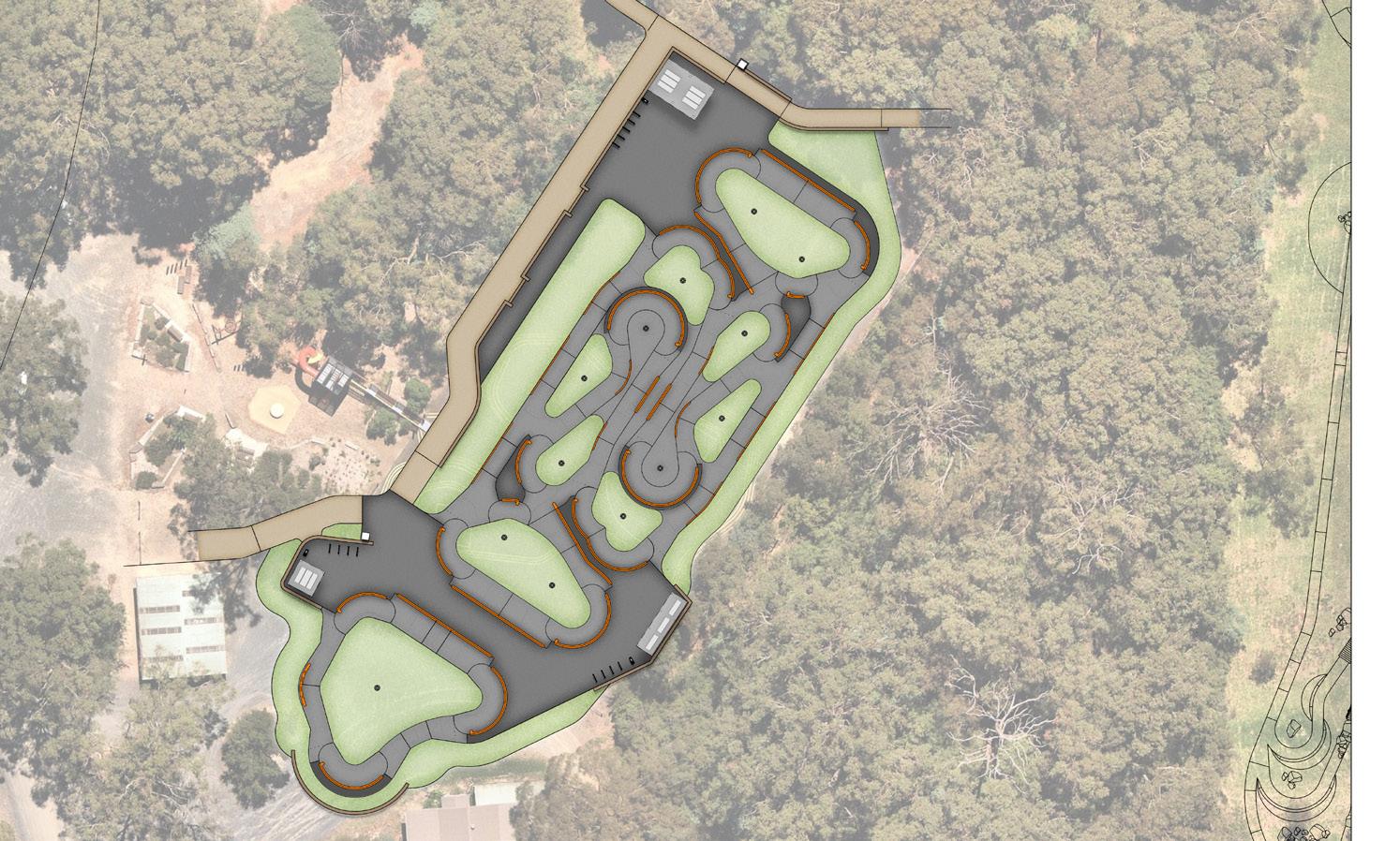 THE BEGINNER TRACK IS APPROXIMATELY 60M LONG AND PROVIDES A MIX OF FEATURES INCLUDING BERMS, ROLLERS, HIPPED ROLLERS, AND A LITTLE DOUBLE JUMP THAT IS COMPLETELY ROLL-ABLE. THERE ARE 3 GOOD SIZED PLATFORMS WHERE A USER CAN REST, AND THE INSIDE OF THE BERMS HAVE FLAT APRONS TO ACCOMMODATE THE USER WHO HASN'T QUITE GOT COMFORTABLE WITH GOING FAST. THE BEGINNER TRACK MAIN PLATFORM INCLUDES A SHELTER, PICNIC SETTING, WATER FOUNTAIN, BIKE RACKS AND RUBBISH BIN FOR USERS AND SUPERVISORS.