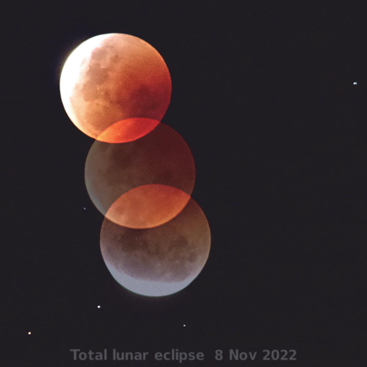 A composite of three photos. The top one was taken a few minutes before total eclipse began, the middle one during total eclipse, and the bottom one a few minutes after total eclipse ended. Between them they indicate the round outline of the Earth's shadow, and that it's darker / redder towards its centre.