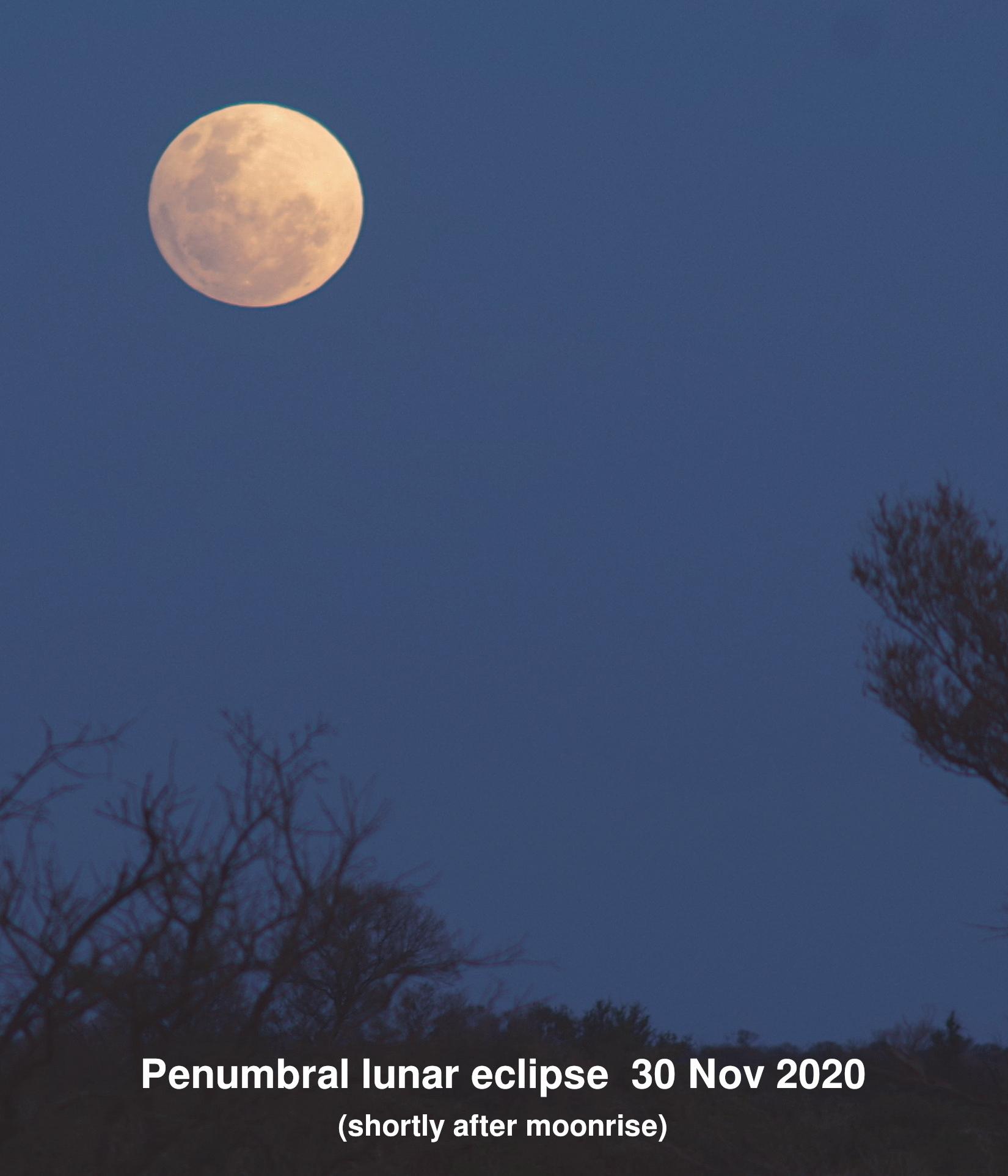 The photo of the 30 November 2020 penumbral eclipse was taken in far north SA. The eclipse geometry was similar to this month's event, but happening during moonrise early evening. So