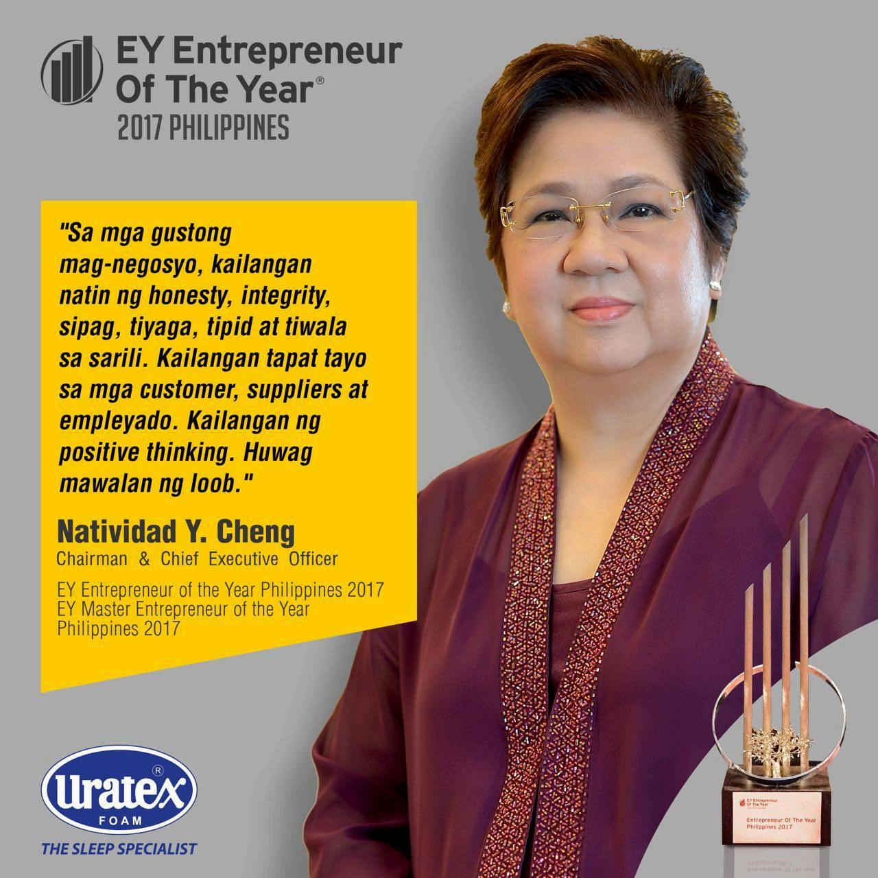 Nearly 50 years ago, Natividad "Naty" Cheng and her husband launched Uratex, a buy-andsell business, from a makeshift outdoor office under a Santol tree. When they struggled to support their growing family, Natividad encouraged her husband to leave his job and start their own venture. Overcoming numerous challenges, she remained steadfast in her vision. They initially struggled to find a reliable source for mattress foam, so they decided to manufacture it themselves. Using their trading savings, they imported a machine from Taiwan and opened their first factory in 1968, which resulted in a hundredfold increase in annual sales Cheng's leadership and dedication to quality have distinguished Uratex, securing its position as an industry leader for more than fifty years Their major breakthrough came when Sheraton Hotel sought a dependable supplier for construction and furniture materials. In recognition of her achievements, Natividad Cheng was named Entrepreneur of the Year 2017 by Ernst & Young and received the title of Master Entrepreneur of the Year in the Philippines.