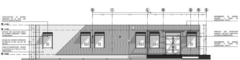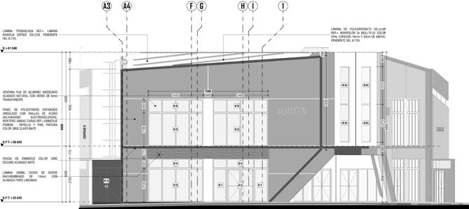 DESARROLLO PBX 88136000 -mail info@estudio84 net www estudio84 net EDIFICIO FECHA 10 05 2018 CONTENIDO EDIFICIO CORTE POR FACHADA - 01 CORTE POR FACHADA - 02 CORTE POR FACHADA - 03 PROPIETARIO DISEÑO Y DESARROLLO DEL PROYECTO ARQ YADER TERCERO MORRAZ ESTUDIO84 ARQUITECTURA ARQ FRANCIS ZEPEDA RIVERA LIC MTI N° 10579 FIRMA PROFESIONALES RESPONSABLES PROYECTO PLAZA COMERCIAL INFORMACIÓN DE LA PROPIEDAD MOD MODIFICACIONES RESP DESCRIPCIÓN FECHA DIBUJÓ LÁMINA 1 2 DA- 9 E- 500 DA- 22 E-A501 N.P.T:+52.380 N.P.T:+55.880 N:+60.880 N:+55.180 8500 150 2400 400 700 750 2575 1525 150 N:+54.780 3500 5000 1351 MONITOR DE TECHO DE LÁMINA GALVANIZADA COLUMNA METÁLICA TIPO CM5 VENTANA DE GUILLOTINA DE ALUMINIO ANODIZADO ACABADO NATURAL VIDRIO DE MM REFLECTIVO COLOR GRIS 2400 400 324 376 CUBIERTA DE LÁMINA TROQUELADA REF LÁMINA BANDEJA SSP500 SOLCON PENDIENTE DEL 14 05% BARANDAL DE ACERO DE TUBO REDONDO 38mm SISTEMA DE ENTREPISOS PLYCEM VER CATÁLOGO DE PROVEEDOR PARA CONOCER DIMENSIONES Y CRITERIOS CONSTRUCTIVOS PARTICIÓN DE LÁMINA TROQUELADA REF= LÁMINA BANDEJA SOLCON SSP380 SOPORTADA POR ESTRUCTURA METÁLICA PARED DE MAMPOSTERÍA CONFINADA DE BLOQUE DE 6 ACABADO APARENTE LADRILLO O BLOQUE SISADO LOSA DE CONCRETO LUJADO CRYSTAL CONCRETE DE CRM SE DEBERÁ UTILIZAR LAS PROPORCIONES NECESARIAS PARA NO INCREMENTAR LA PULIDA Y OBTENER UN ACABADO NO RESBALISO MARCO METÁLICO ESTRUCTURAL DIMENSIONES FUNDACIONES DEFINIDAS POR ESPECIALISTA LÁMINA DE POLICARBONATO CELULAR REF= MAKROLON 3 MULLTI-UV COLOR OPAL ESPESOR 16mm 50cm DE ANCHO VIGA DE CONCRETO TIPO VC VIGA METÁLICA TIPO VE1 FLASHING DE LÁMINA DE ACERO ESMALTADO 24 ATORNILLAR PARED DAR DOS MANOS DE PINTURA ANTICORROSIVA CORROSTOP PENDIENTE DEL 2% CLAVADOR DE PARED TIPO P2 CORTINA METÁLICA ARROLLABLE PARED DE POLIURETANO ISOBOX DE 6 EN ACABADO ACANALADO Y FIJACIÓN A VISTA REF=(MARCA ISOCINDU COLOR GRIS SILVER G9006 BARANDAL DE ACERO DE TUBO REDONDO 38mm SOLDADO A ESTRUCTURA DE ESCALERA METÁLICA COLUMNA METÁLICA TIPO CM5 A A´ DA-E E- 500 DA-E10 E- 500 N:+55.180 N:+54.780 N.P.T:+55.880 N:+59.880 2400 400 700 3413 587 7500 N:+59.143 N.P.T:+52.380 COLUMNA METÁLICA TIPO CM5 FLASHING DE LÁMINA DE ACERO ESMALTADO 24 ATORNILLAR PARED DAR DOS MANOS DE PINTURA ANTICORROSIVA CORROSTOP PENDIENTE DEL 2% CUBIERTA DE LÁMINA TROQUELADA REF= LÁMINA BANDEJA SSP500 SOLCON PENDIENTE DEL 14 05% MARCO METÁLICO ESTRUCTURAL DIMENSIONES Y FUNDACIONES DEFINIDAS POR ESPECIALISTA PARTICIÓN DE LÁMINA TROQUELADA REF= LÁMINA BANDEJA SOLCON SSP380 SOPORTADA POR ESTRUCTURA METÁLICA BARANDAL DE ACERO DE TUBO REDONDO 38mm VIGA DE CONCRETO TIPO VC CORTINA METÁLICA ARROLLABLE SISTEMA DE ENTREPISOS PLYCEM VER CATÁLOGO DE PROVEEDOR PARA CONOCER DIMENSIONES Y CRITERIOS CONSTRUCTIVOS LOSA DE CONCRETO LUJADO CRYSTAL CONCRETE DE CRM SE DEBERÁ UTILIZAR LAS PROPORCIONES NECESARIAS PARA NO INCREMENTAR LA PULIDA Y OBTENER UN ACABADO NO RESBALISO CANAL DE AGUA PLUVIAL DE LÁMINA DE ZINC LISO CAL#24 CLAVADOR DE PARED TIPO P2 VIGA METÁLICA TIPO VE1 PARED DE POLIURETANO ISOBOX DE 6 EN ACABADO ACANALADO Y FIJACIÓN A VISTA REF=(MARCA ISOCINDU COLOR GRIS SILVER G9006 ACERA DE CONCRETO ACABADO ARENILLADO PENDIENTE DEL % D DS- 76 -S509 DS-C76 -S509 N:+55.130 N:P.T+52.380 N:+58.380 N:+59.880 2100 650 3250 1350 N:+54.480 FLASHING DE LÁMINA DE ACERO ESMALTADO 24 ATORNILLAR PARED DAR DOS MANOS DE PINTURA ANTICORROSIVA CORROSTOP PENDIENTE DEL 2% CUBIERTA DE LÁMINA TROQUELADA REF= LÁMINA BANDEJA SSP500 SOLCON PENDIENTE DEL 14 05% LOSA DE CONCRETO LUJADO CRYSTAL CONCRETE DE CRM SE DEBERÁ UTILIZAR LAS PROPORCIONES NECESARIAS PARA NO INCREMENTAR LA PULIDA OBTENER UN ACABADO NO RESBALISO CANAL DE AGUA PLUVIAL DE LÁMINA DE ZINC LISO CAL#24 PARED DE POLIURETANO ISOBOX DE EN ACABADO ACANALADO FIJACIÓN A VISTA REF=(MARCA ISOCINDU COLOR GRIS SILVER G9006 VENTANA DE GUILLOTINA DE ALUMINIO ANODIZADO ACABADO NATURAL VIDRIO DE MM REFLECTIVO COLOR GRIS PANEL DE POLIESTIRENO EXPANDIDO ONDULADO CON MALLAS DE ACERO GALVANIZADO ELECTROSOLDADAS MORTERO AMBAS CARAS REF EMMEDUE PSME80 REPELLO Y FINO PINTURA COLOR BLANCO MATE LÁMINA DE POLICARBONATO CELULAR REF= MAKROLON x MULLTI-UV COLOR OPAL ESPESOR 16mm 50cm DE ANCHO ACERA DE CONCRETO ACABADO ARENILLADO PENDIENTE DEL 2% CORTINA METÁLICA ARROLLABLE PUERTA DOBLE HOJA ABATIBLE DE ALUMINIO ANODIZADO ACABADO NATURAL VIDRIO REFLECTIVO mm HERRAJES Y ACCESORIOS DEFINIDOS POR CONTRATISTA COLUMNA METÁLICA TIPO CM VIGA METÁLICA TIPO VM CF-A01 CORTE POR FACHADA - 01 ESCALA 1 25 CF-A02 CORTE POR FACHADA - 02 ESCALA 1 25 CF-A03 CORTE POR FACHADA - 03 ESCALA 1:25 PROYECTO PLAZA COMERCIAL DA-D15 D-A501 N.P.T:+52.540 N.P.T:+56.040 7550 VARIABLE 3500 4050 2400 400 700 2000 2050 LÁMINA TROQUELADA REF= LÁMINA BANDEJA SS500 SOLCON PENDIENTE DEL 75% PARED DE MAMPOSTERÍA CONFINADA DE BLOQUE DE ACABADO APARENTE LADRILLO O BLOQUE SISADO PARTICIÓN DE LÁMINA TROQUELADA REF= LÁMINA BANDEJA SOLCON SSP380 SOPORTADA POR ESTRUCTURA METÁLICA CIELO FALSO DE GYPSUM DE ACABADO PASTEADO Y LIJADO PINTURA COLOR BLANCO MATE ENTREPISO DE CONCRETO LUJADO CRYSTAL CONCRETE DE CRM SE DEBERÁ UTILIZAR LAS PROPORCIONES NECESARIAS PARA NO INCREMENTAR LA PULIDA OBTENER UN ACABADO NO RESBALISO BAJANTE DE AGUA PLUVIAL DE PVC Ø150mm SDR 26 EN EL TRAMO EXPUESTO SDR 32 5 EN TRAMOS SOTERRADOS FLASHING DE LÁMINA DE ACERO ESMALTADO 24 ATORNILLAR A PARED DAR DOS MANOS DE PINTURA ANTICORROSIVA CORROSTOP PENDIENTE DEL % LOSA DE CONCRETO LUJADO CRYSTAL CONCRETE DE CRM SE DEBERÁ UTILIZAR LAS PROPORCIONES NECESARIAS PARA NO INCREMENTAR LA PULIDA OBTENER UN ACABADO NO RESBALISO ACERA DE CONCRETO ACABADO ARENILLADO PENDIENTE DEL % DA-D01 D-A600 DA-D16 D-A501 3500 5900 150 N.P.T:+52.540 N.P.T:+56.040 N:+61.940 9400 LÁMINA TROQUELADA REF= LÁMINA BANDEJA SS500 SOLCON PENDIENTE DEL 75% CIELO FALSO DE GYPSUM DE ACABADO PASTEADO Y LIJADO PINTURA COLOR BLANCO MATE ENTREPISO DE CONCRETO LUJADO CRYSTAL CONCRETE DE CRM SE DEBERÁ UTILIZAR LAS PROPORCIONES NECESARIAS PARA NO INCREMENTAR LA PULIDA Y OBTENER