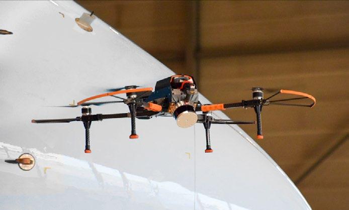 av drönare. Drönarna flyger i ett fast rutnät över planets yta och tar upp till 1 000 högupplösta bilder. Den inbyggda programvaran analyserar bilderna och rapporterar om eventuella problem eller slitage på färgskiktet. Dessa standardiserade inspektioner är mindre subjektiva, och är också snabbare och mer djupgående än manuella inspektioner. En automatiserad drönare kan skanna en hel flygplanskropp på mindre än en timme.