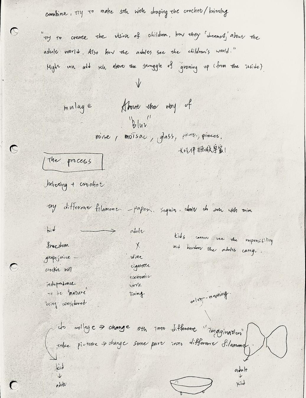 This idea was sparked by a collage I created on the previous page. As I worked on it, I kept trying to recall how I used to enjoy drawing as a child. During this creative process, I felt an overwhelming sense of helplessness. The more I tried to emulate the actions of a child, the farther I felt from achieving that state. It was as though a vast chasm separated the adult world from the simplicity of childhood.