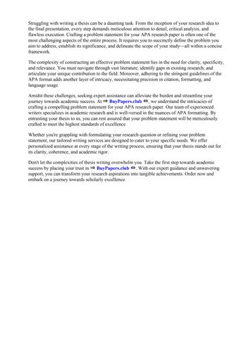 Amidst these challenges, seeking expert assistance can alleviate the burden and streamline your journey towards academic success. At ⇒ BuyPapers.club ⇔, we understand the intricacies of crafting a compelling problem statement for your APA research paper. Our team of experienced writers specializes in academic research and is well-versed in the nuances of APA formatting. By entrusting your thesis to us, you can rest assured that your problem statement will be meticulously crafted to meet the highest standards of excellence.