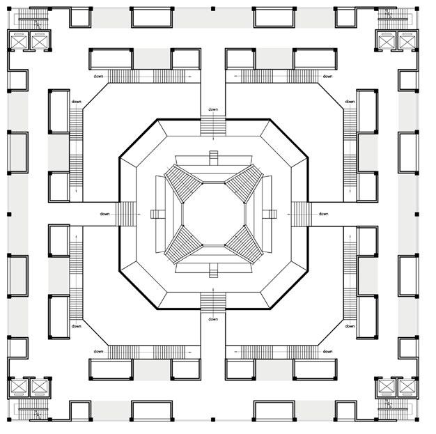 The outer cylinder adopts a GLT wooden pole with a section size of 400*200mm, and the inner cylinder adopts a GLT wooden pole with a section size of 200*200mm. All joints are assembled bolt joints, which can be adapted to different rod orientations by adjusting the angle of the lugs.The floor slab adopts CLT-steel coupling beam platform plate. Similarly, the stair section also adopts CLT-steel coupling beam stair section slab.