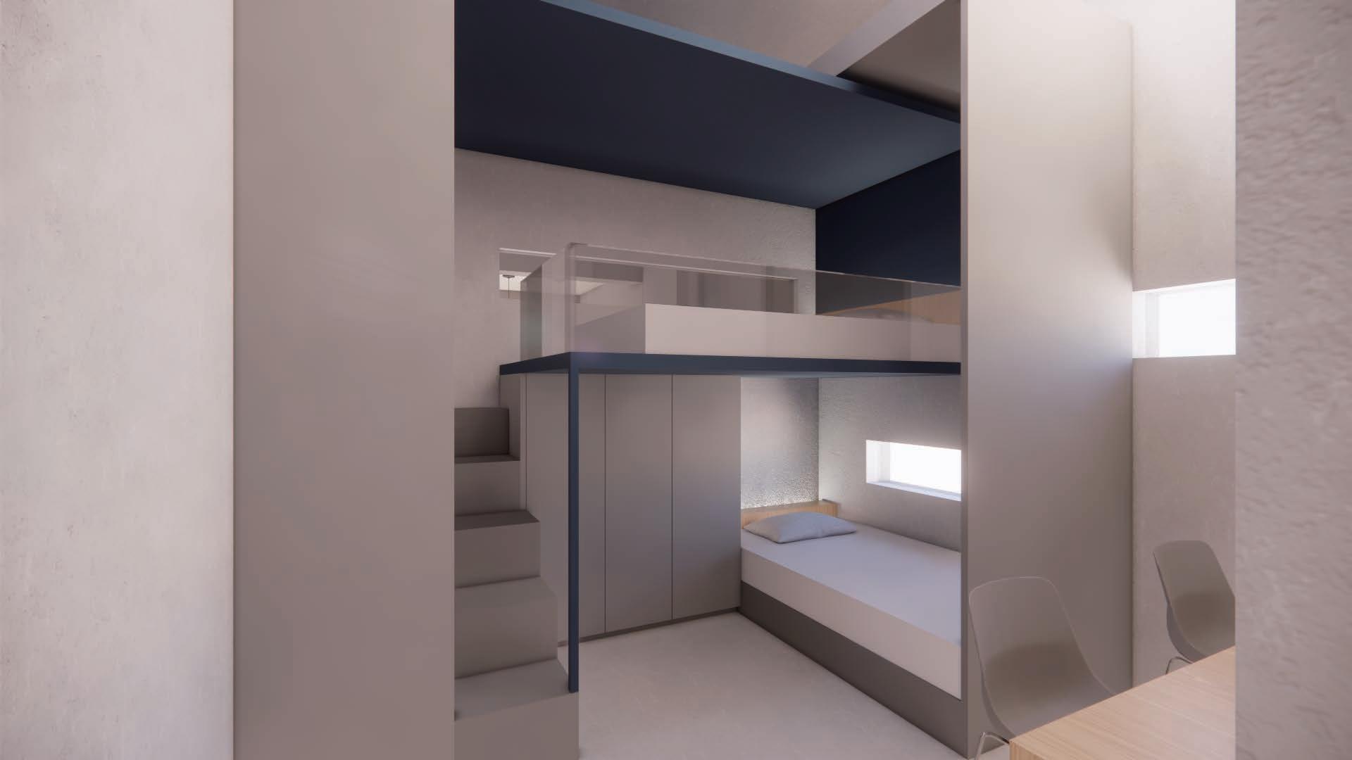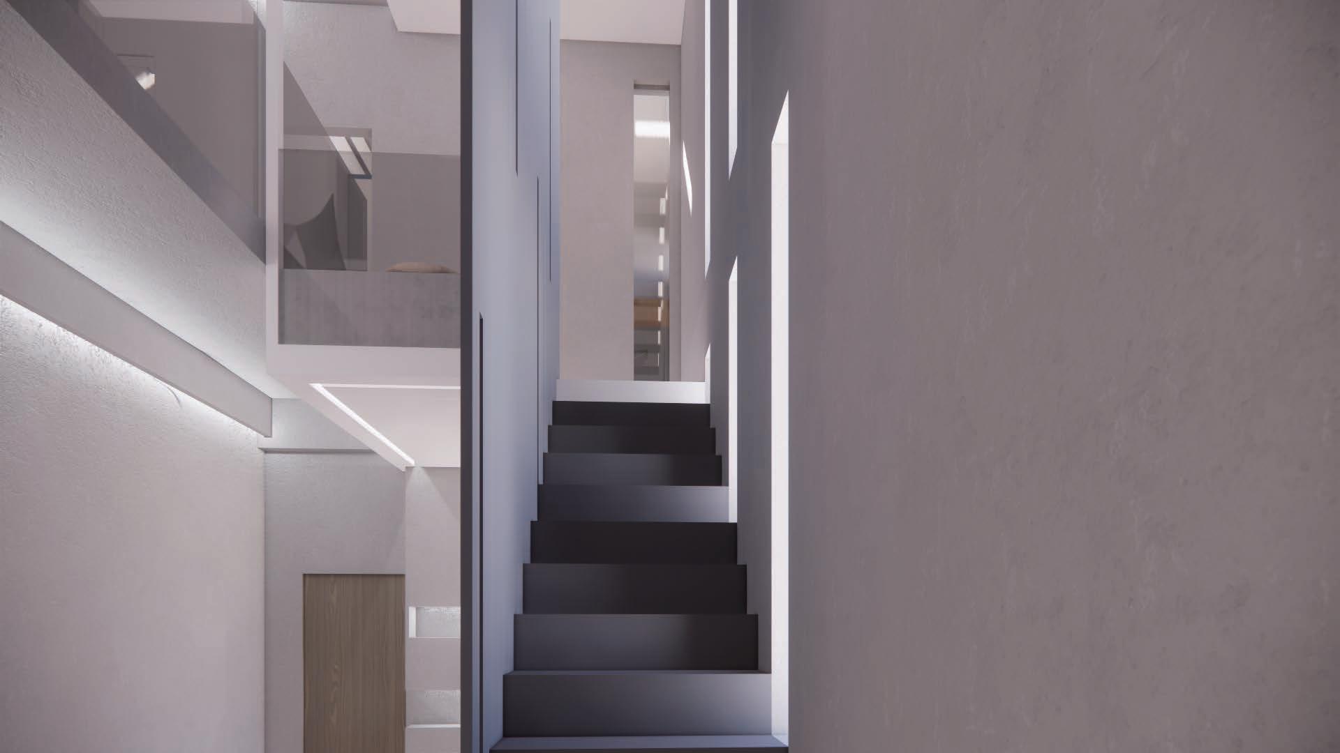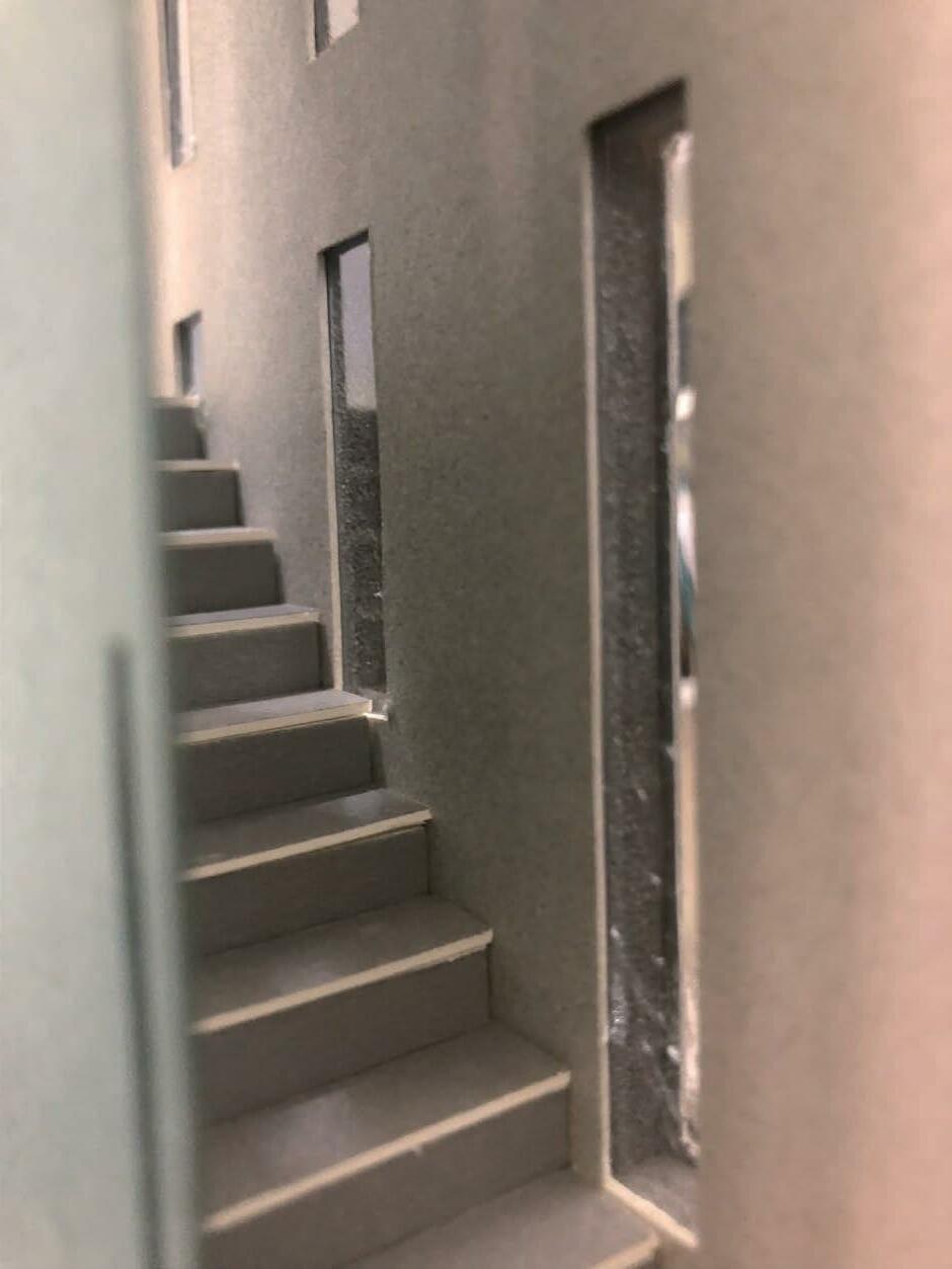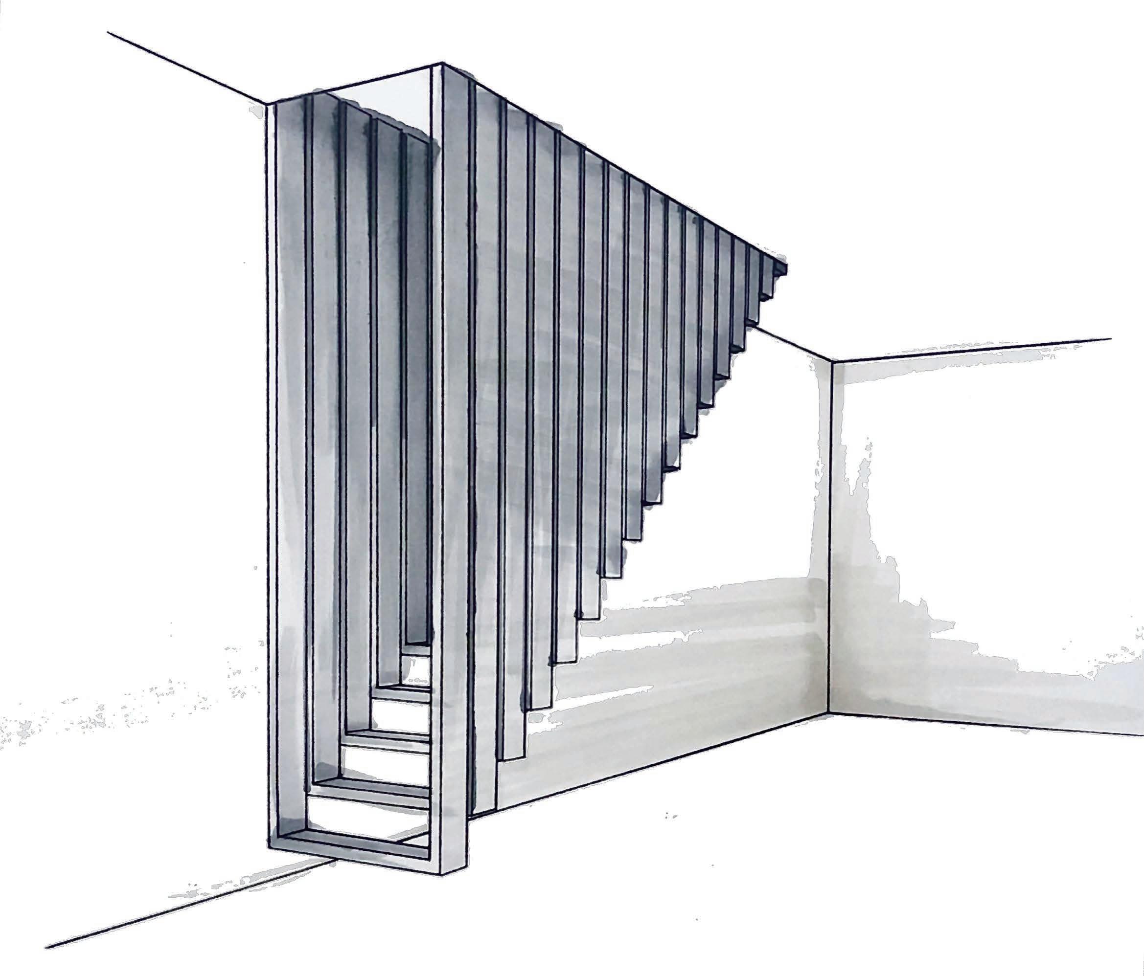 設計說明: 從此次設計的核心概念-創造「空 間中的空間」 再轉化,將塊體切 割、分離、錯位,讓樓梯也成 為 一個獨立的空間。 樓梯形式: 直梯 樓梯材料: 鋼構