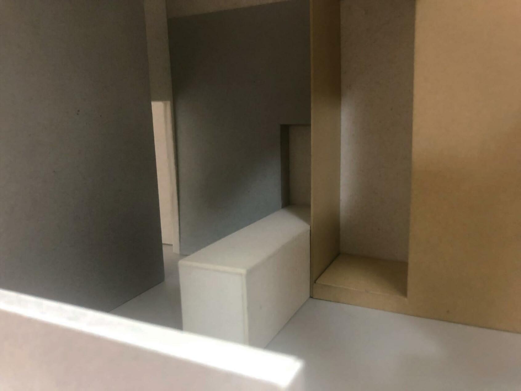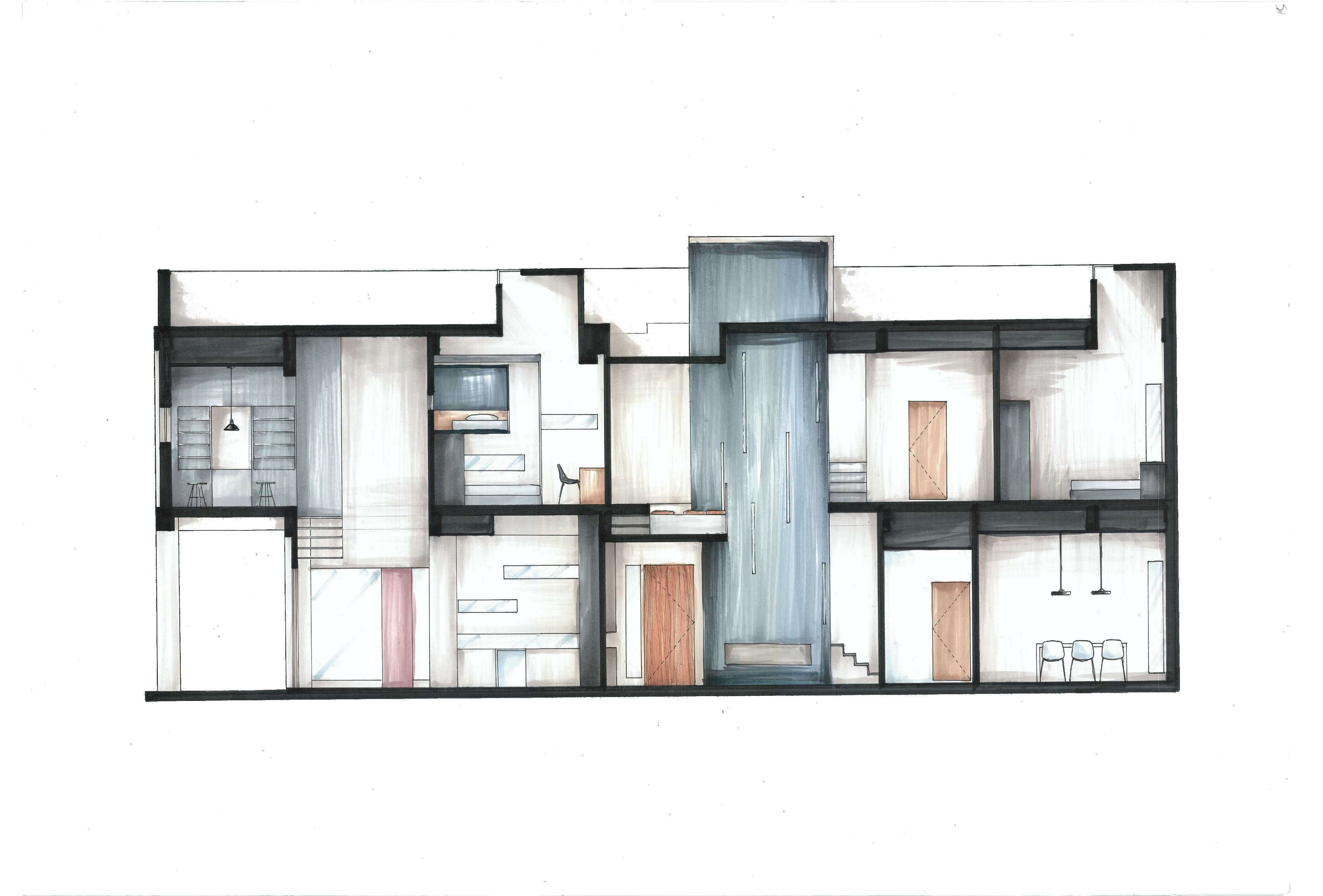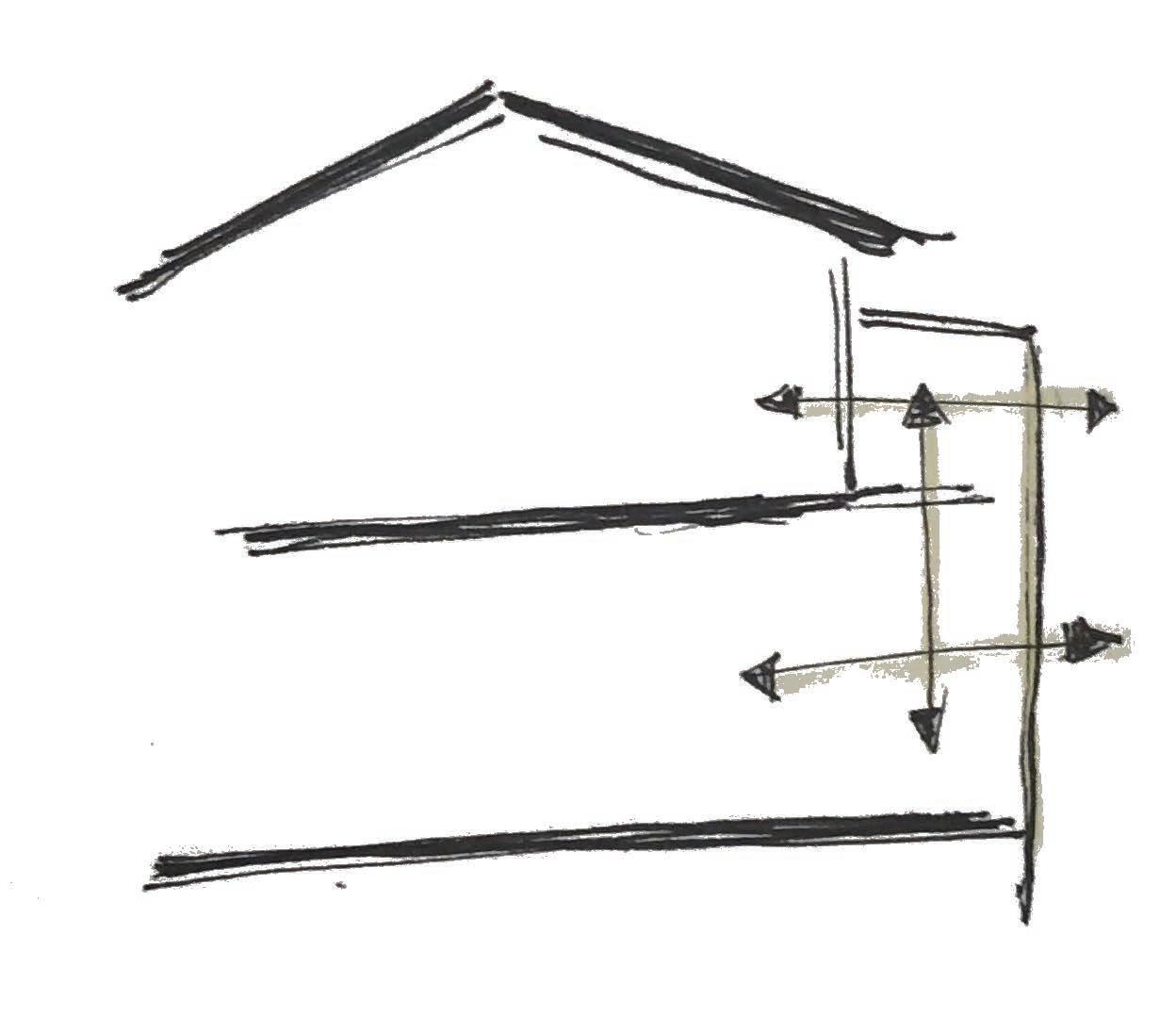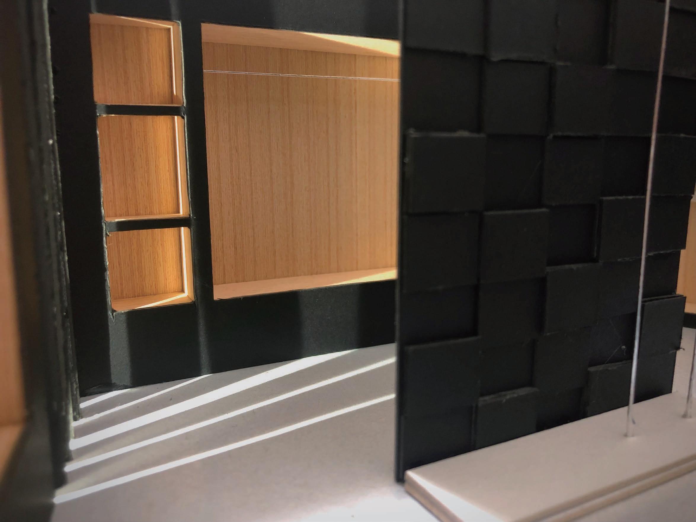 設計元素 交錯堆疊 框架 框景利用狹窄的窗縫,框出一個視線範圍,窺看空間中的另一個空間,使用樓層的錯位、天地壁的配合,形成特為突出的量體,唯自成一處的空間。量體與量體的交錯重疊,形成空間之間的互動以及視覺上最值觀的「空間中的空間」