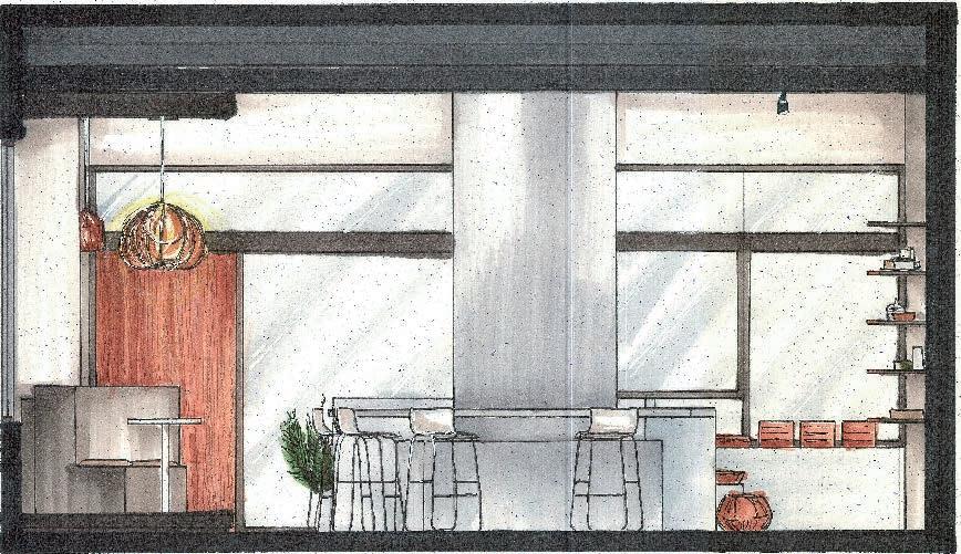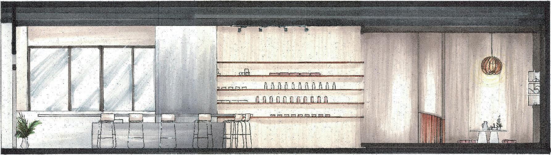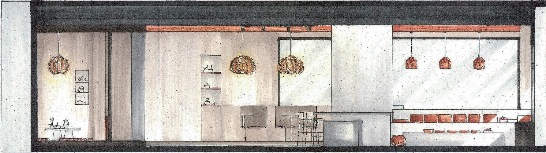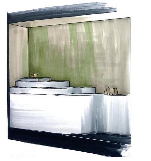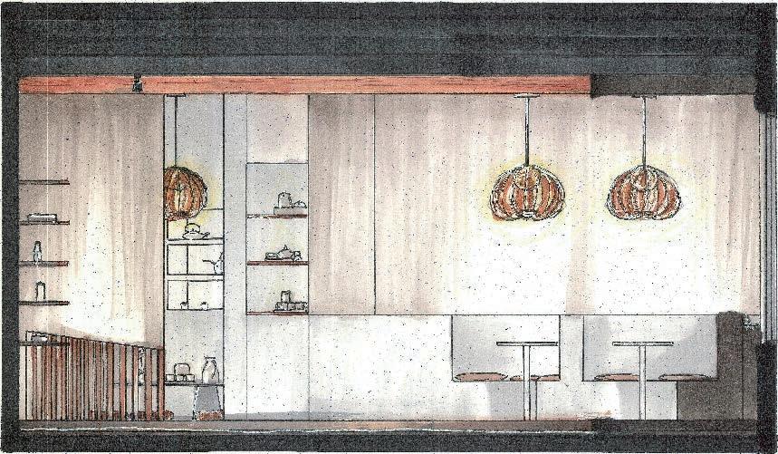 商業模式.茶飲+茶點.茶具/茶葉 / 茶點販售 材質/色彩計畫間做結合,讓附近的住戶可以購買,並帶回家烹飪。這個空間傳達給顧客。此外,因基地所處位置為住宅區,故選擇販售坪林當地的小農農產品與餐飲空結合所選品牌特色,希望能創造一個能休閒品茶的空間,同時希望能將坪林在地的自然人文特色透過.小農農產品黑色鐵件水泥石英石玻璃