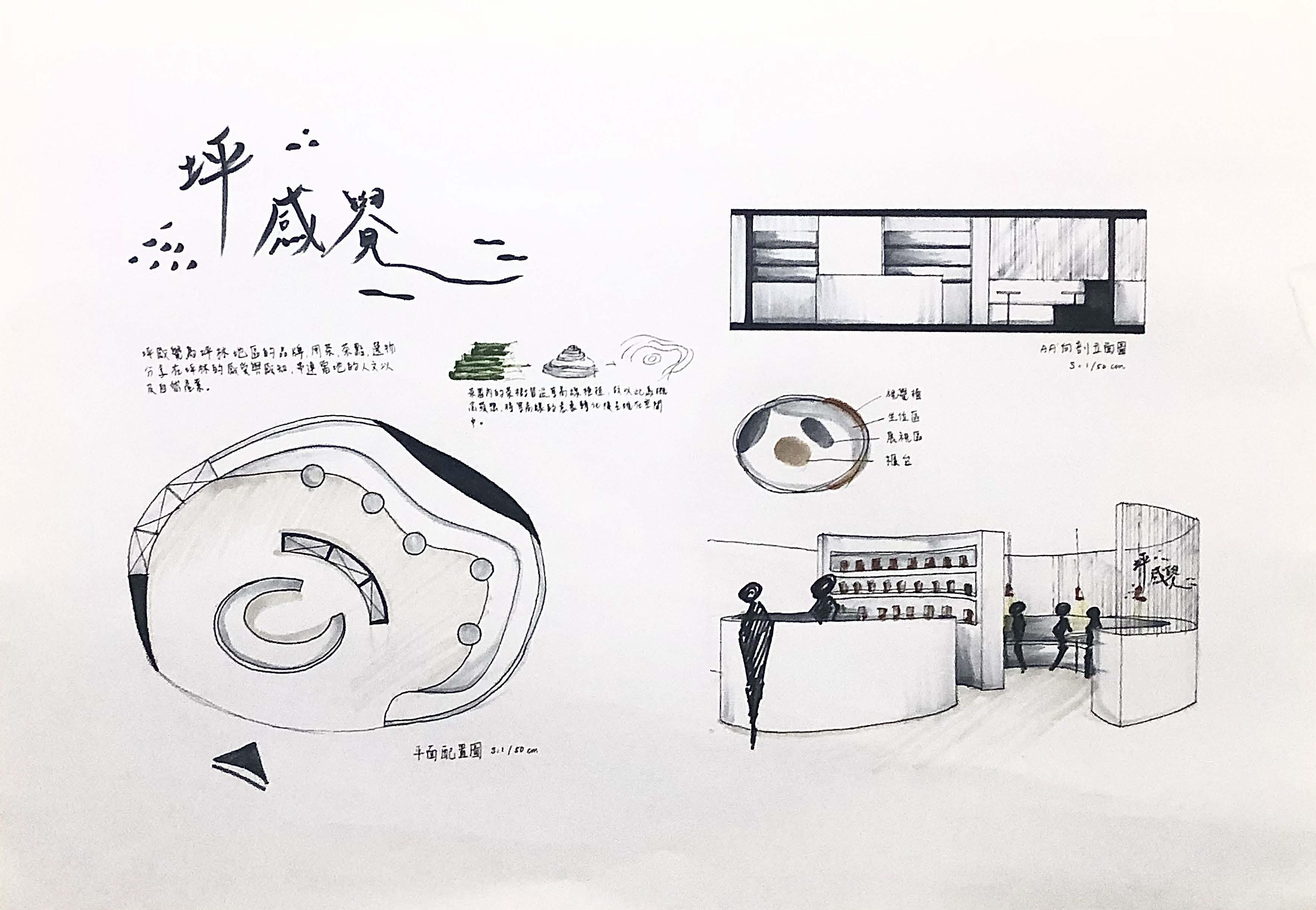 地貌以及茶園意象。以及層次堆疊的純象用茶園內的茶樹街沿等高線種植,形成梯田意以坪林當地的山地以及茶園作為然及人文風情,因所選品牌主要核心精神為發揚坪林地區的自且以茶類為主要販售商品,故概念發想,採為設計元素,使用灰階色彩,營造流線型型淨空間,表達出當地的地形
