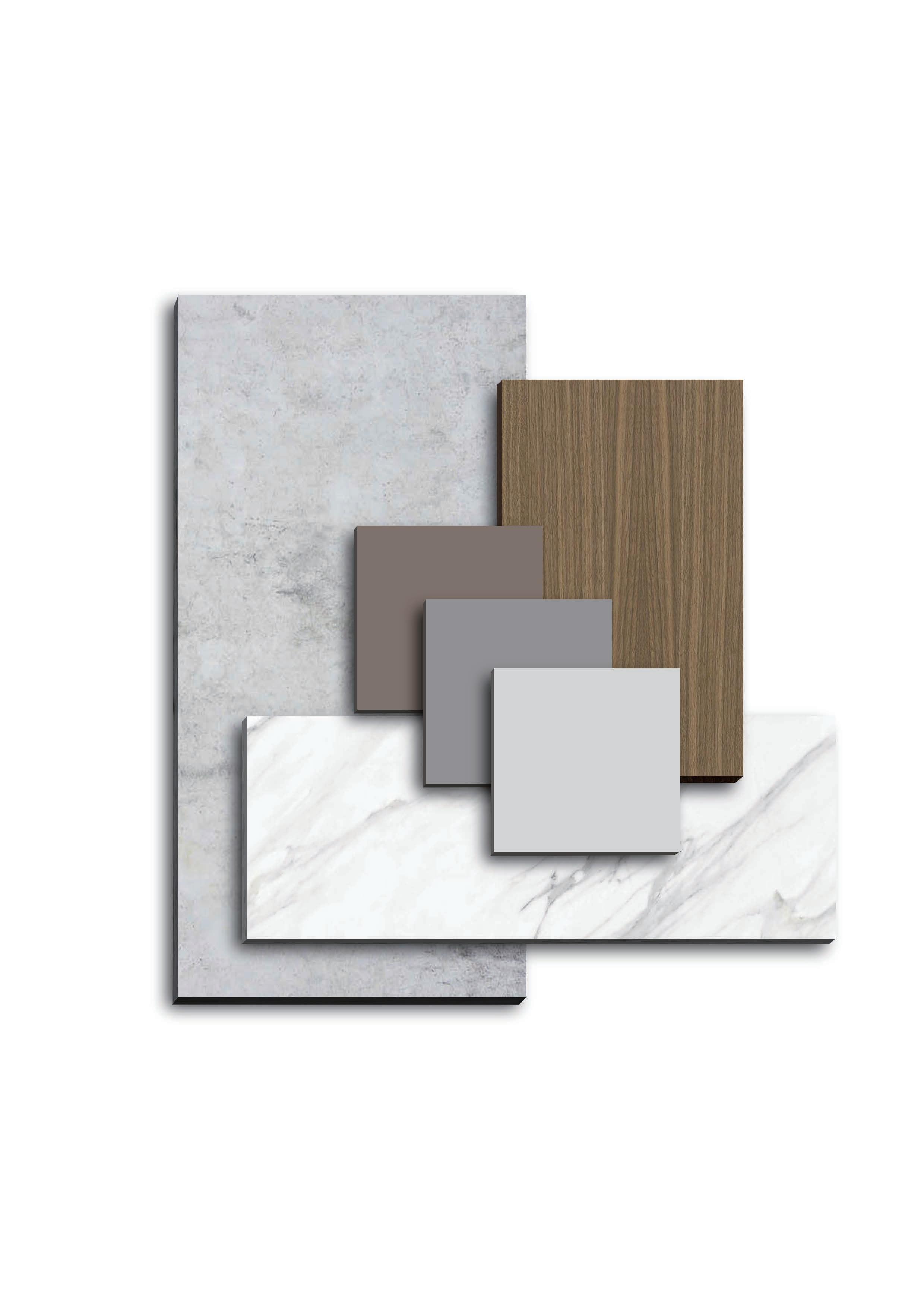 設計元素 神秘感 / 留白 / 藝術 / 對比 / 不對稱 使用Limi Feu 材質/色彩計畫,並將每個產品視為一件藝術品。的設計元素來營造空間,色彩運用上的對比、櫃體上的留白、空間中左右及上下的不對稱黑色塑鋁板木皮板石英石玻璃