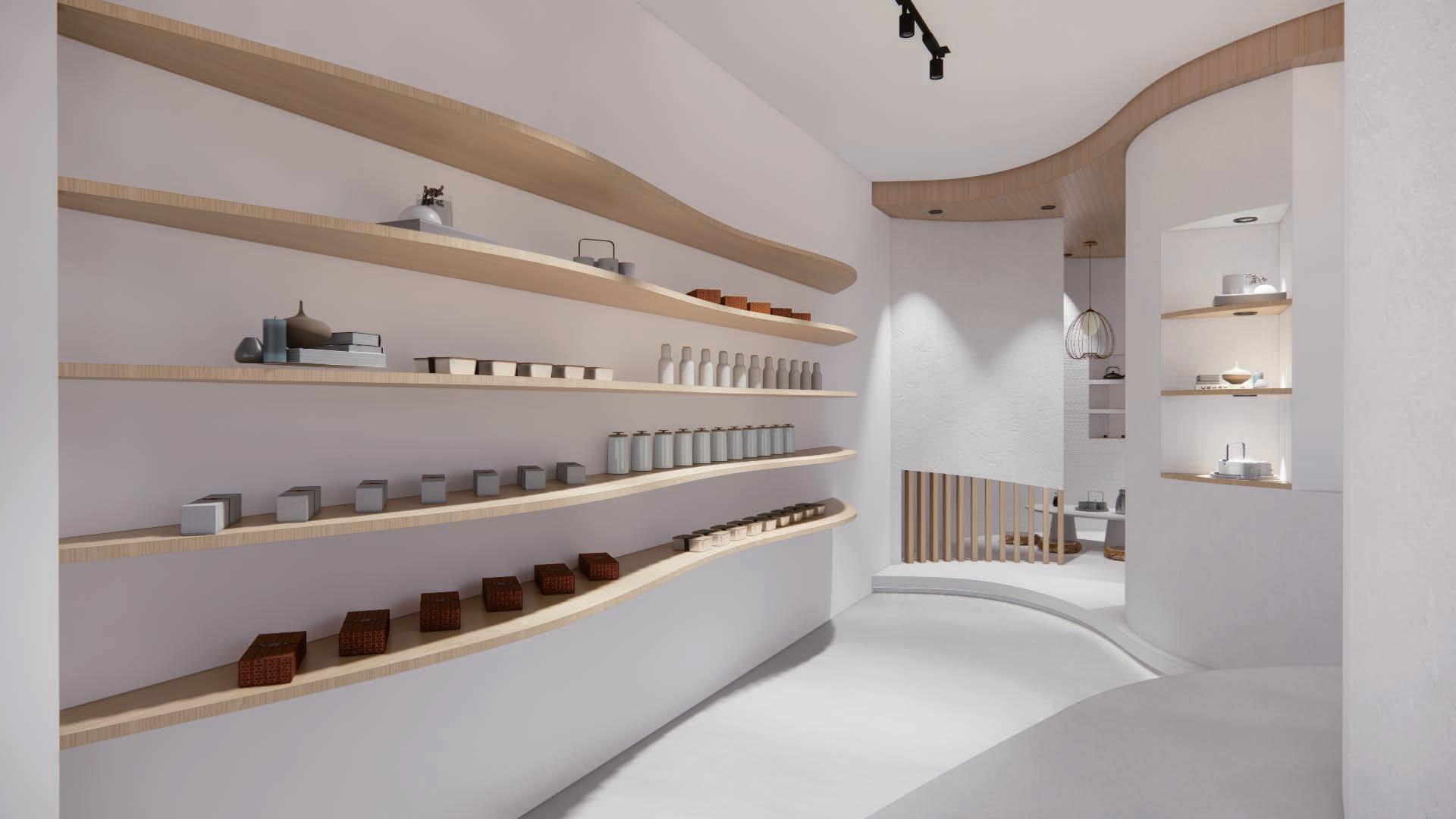 高櫃設計的反差凸顯出展示空間。用讓櫃體看起來較為生動、有趣,再利用色彩商品都有屬於自己的獨立展示空間。弧線的運在完整的塊體上開出不同形狀的開口,讓每個