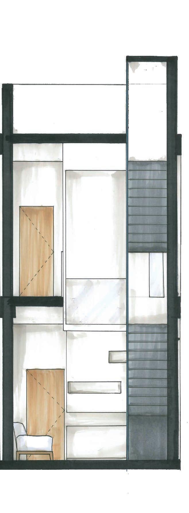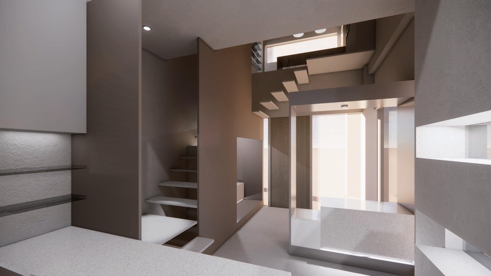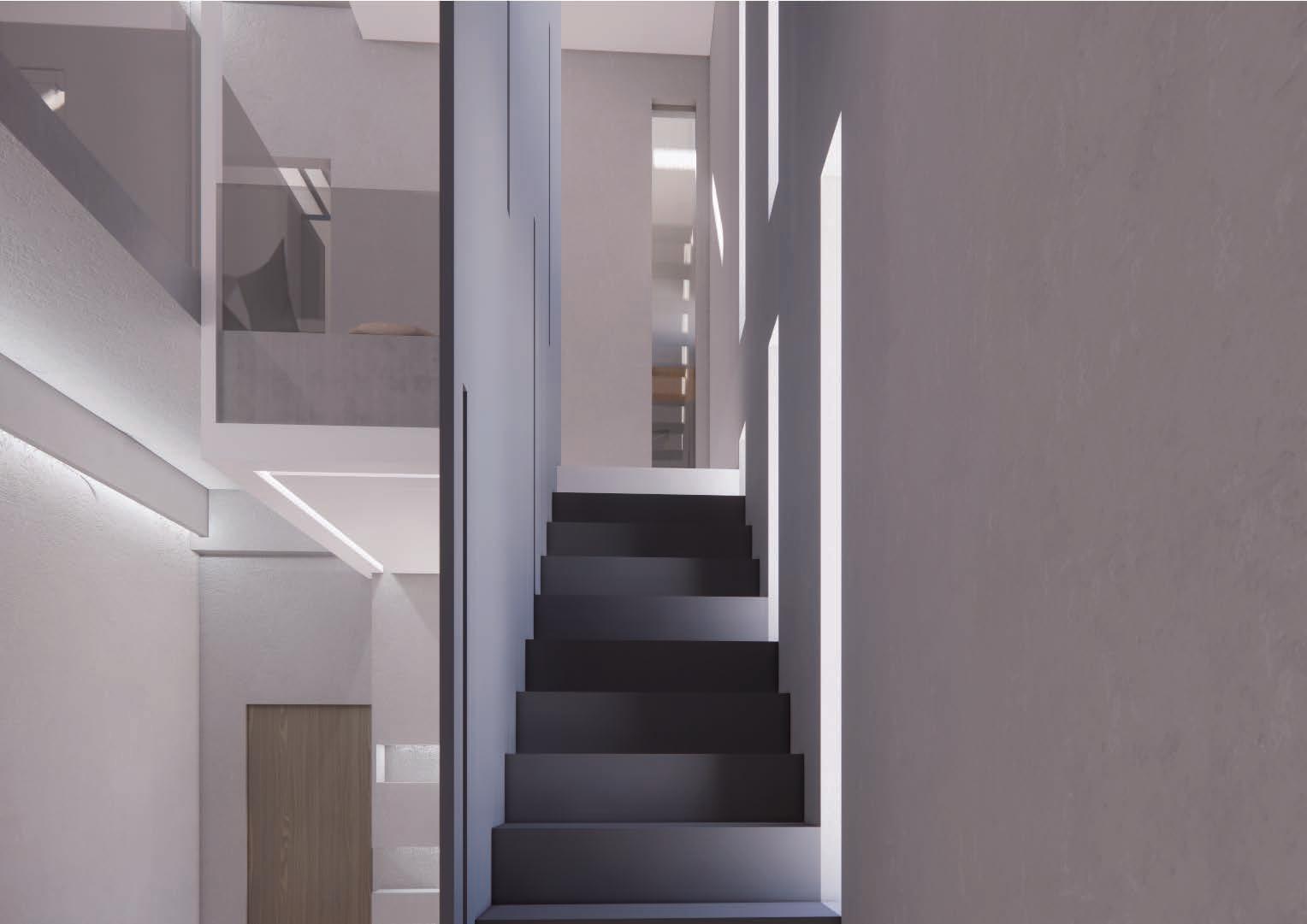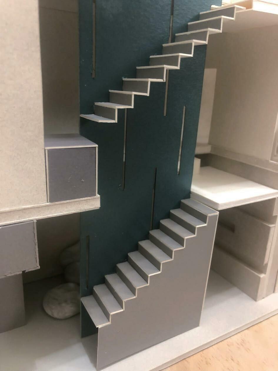 設計說明: 從此次設計的核心概念-創造「空 間中的空間」 再轉化,將塊體切 割、分離、錯位,讓樓梯也成 為 一個獨立的空間。 樓梯形式: 直梯 樓梯材料: 鋼構