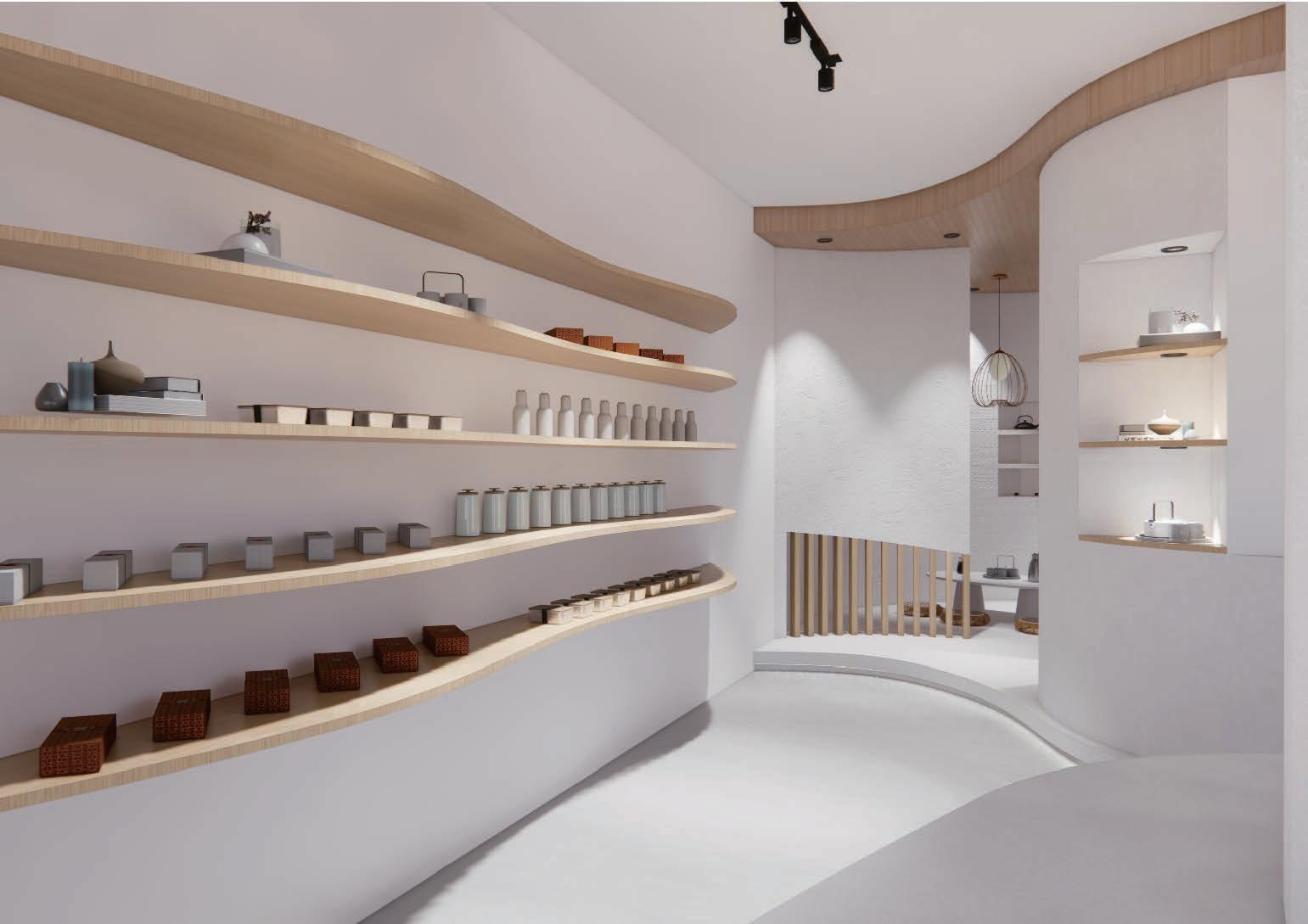 高櫃設計的反差凸顯出展示空間。用讓櫃體看起來較為生動、有趣,再利用色彩商品都有屬於自己的獨立展示空間。弧線的運在完整的塊體上開出不同形狀的開口,讓每個