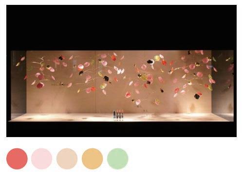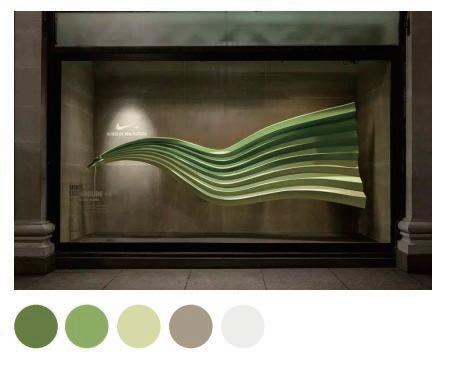 2013年東京銀座資生堂櫥窗設計。櫥窗用金色鋼絲把各種花瓣串聯形 成一道花的帷幕,選用能代表 春天意象的色彩作為主要展示色調,在 純色的櫥窗背景下遠遠看去像是下起了花瓣雨,意圖營造日 本的自然 為運動品牌文化以及花季風情。NIKE的櫥窗設計。以較為自然的水泥色調為基底, 深色的底面打出一道光,讓人 將視線具焦在品牌 Logo 上,而深 色的底面同時也可以凸顯前方的造型設計。主色調為漸層的 綠色, 使用流線型的量體營造品牌意象,與品牌運動鞋上的線條互相呼 應,營造滑順的感覺。 流線型的線條最終聚焦在櫥窗內的商品上, 影領顧客的視覺