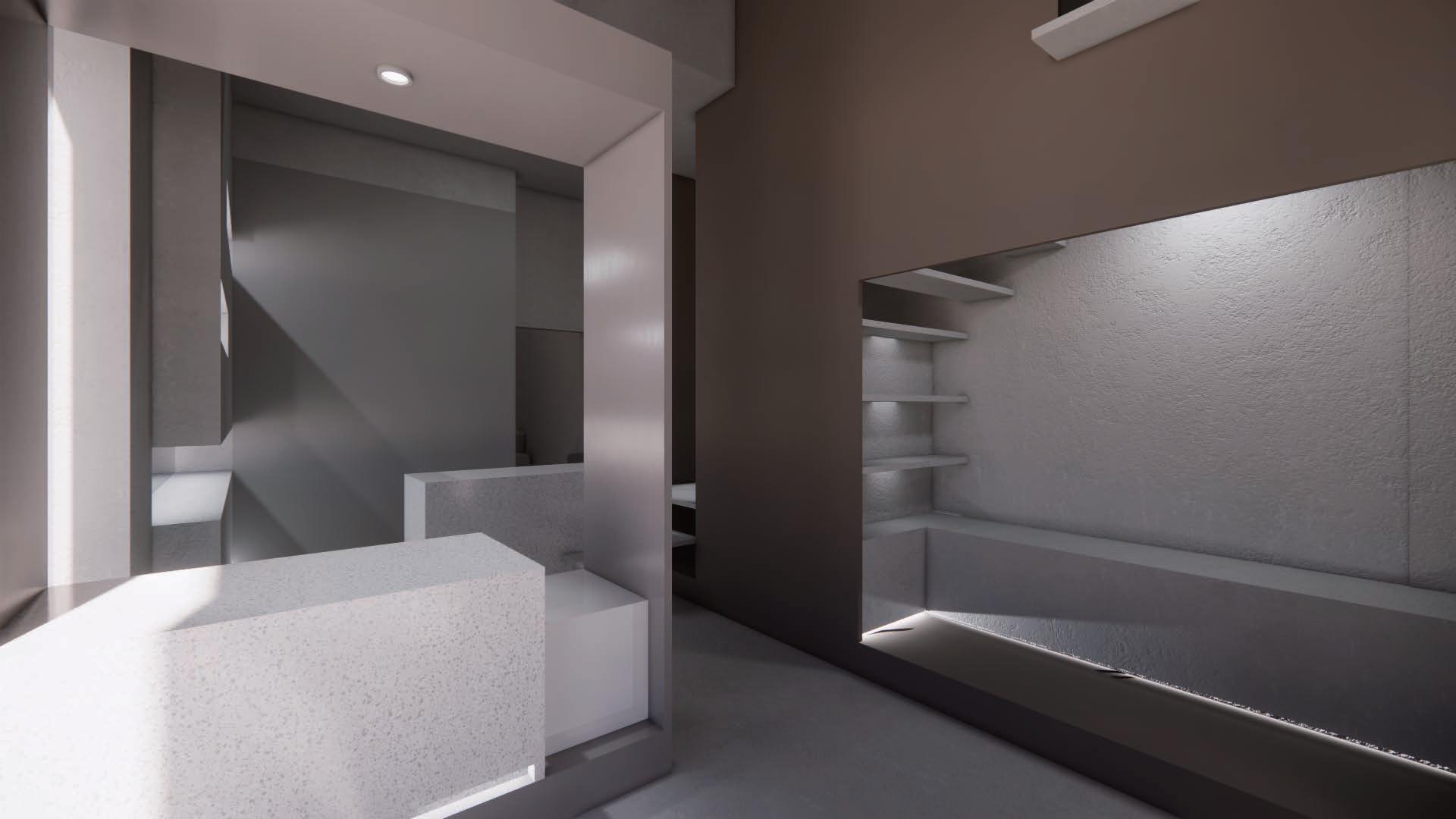 設計元素 神秘感 / 留白 / 藝術 / 對比 / 不對稱 使用Limi Feu 材質/色彩計畫,並將每個產品視為一件藝術品。的設計元素來營造空間,色彩運用上的對比、櫃體上的留白、空間中左右及上下的不對稱黑色塑鋁板木皮板石英石玻璃