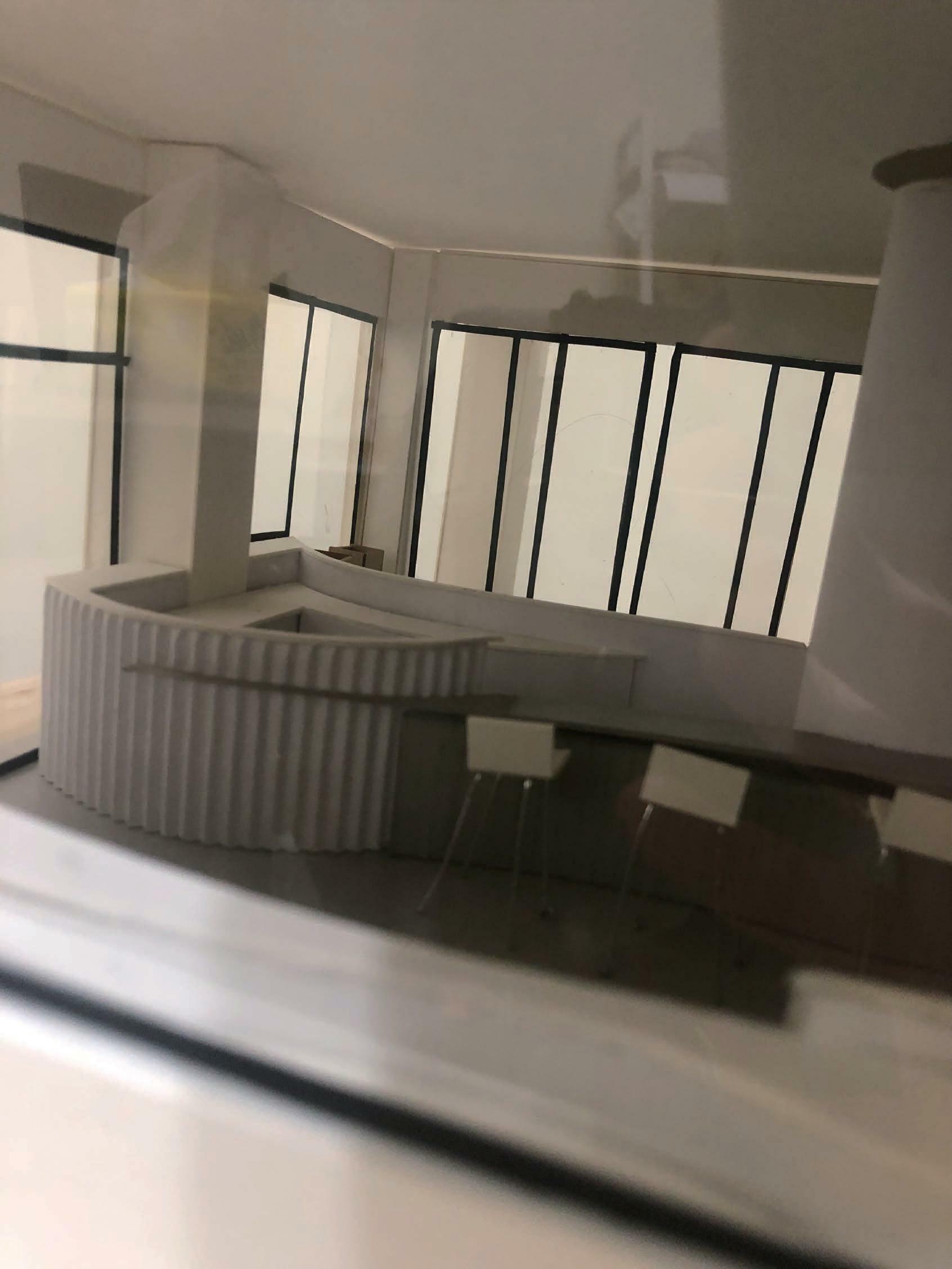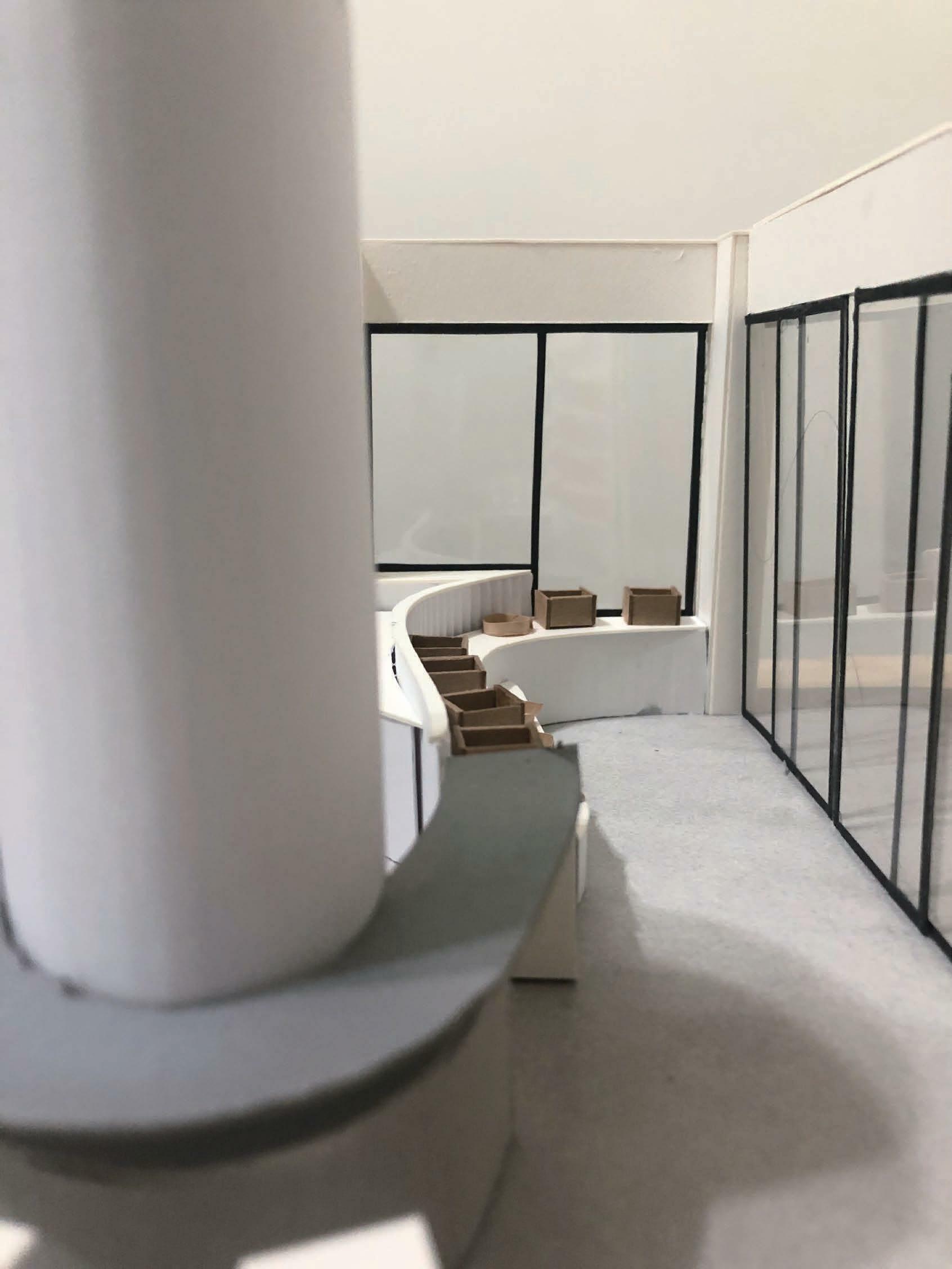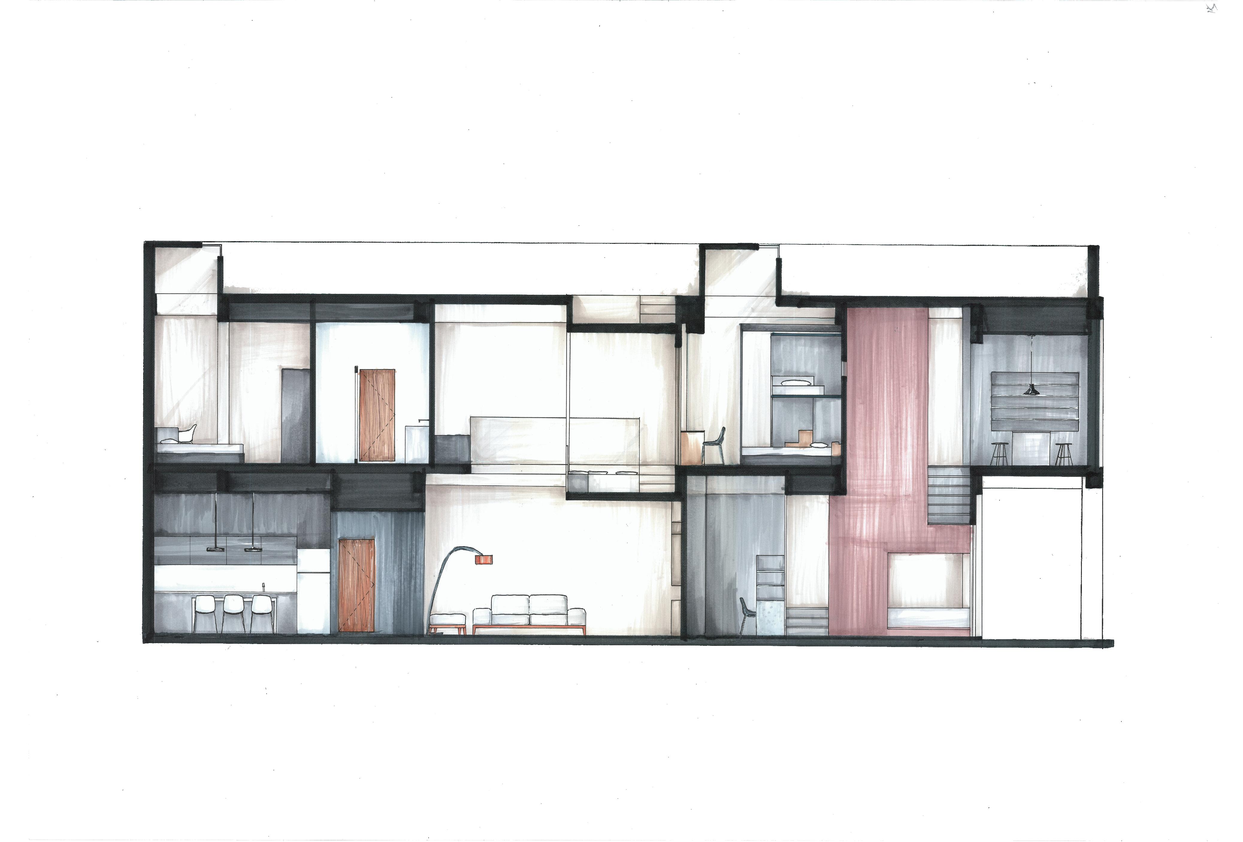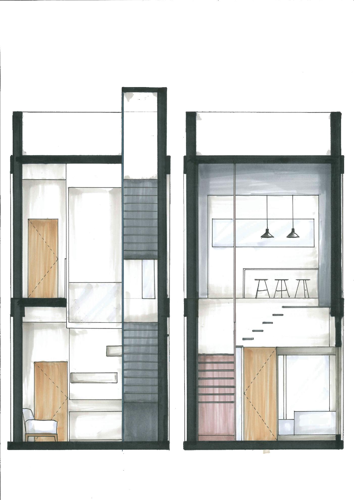 設計元素 交錯堆疊 框架 框景利用狹窄的窗縫,框出一個視線範圍,窺看空間中的另一個空間,使用樓層的錯位、天地壁的配合,形成特為突出的量體,唯自成一處的空間。量體與量體的交錯重疊,形成空間之間的互動以及視覺上最值觀的「空間中的空間」